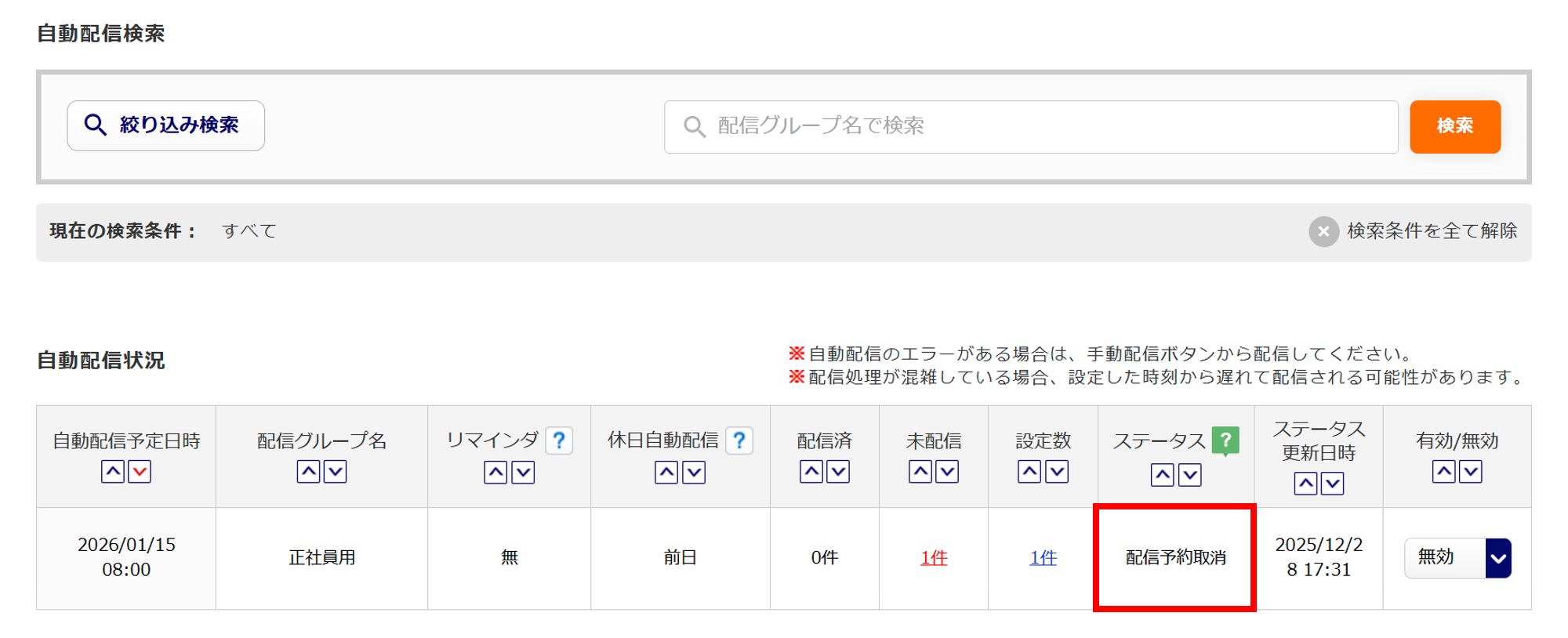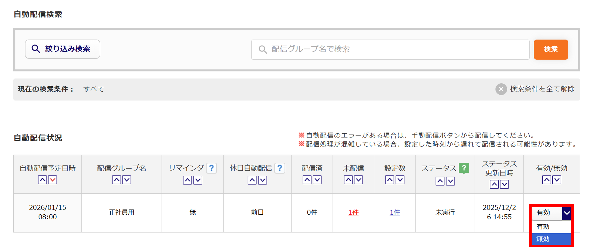 予約を取り消したい配信グループの「有効/無効」から、「無効」を選択します。