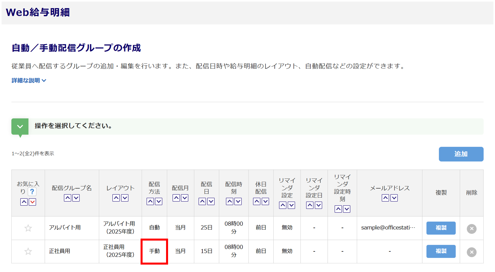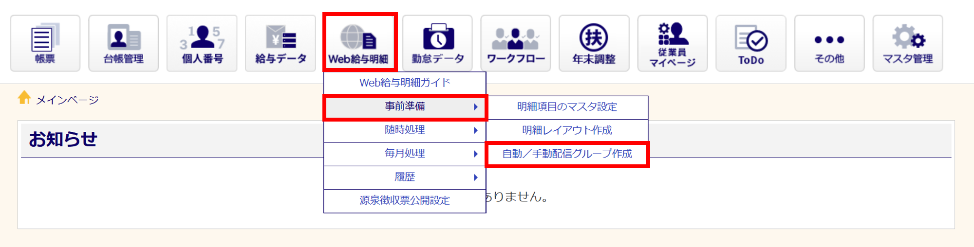 [Web給与明細]>[事前準備]>[自動/手動配信グループ作成]をクリックします。