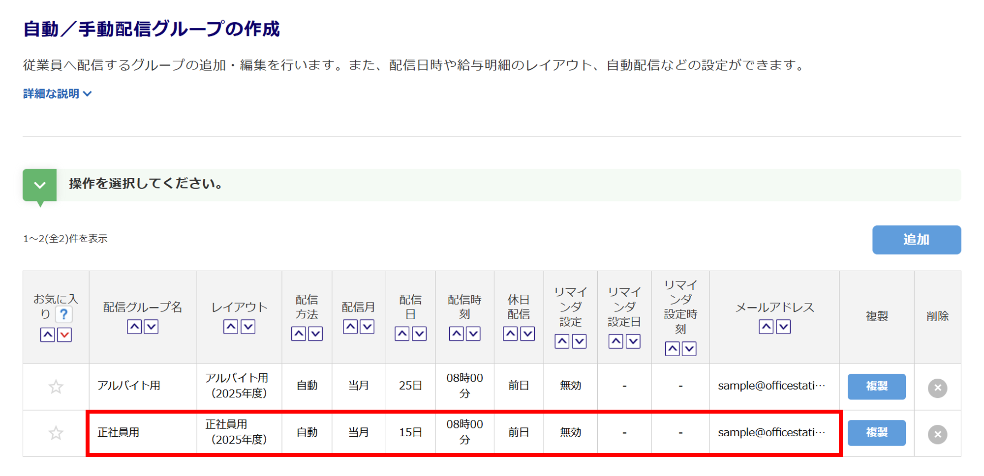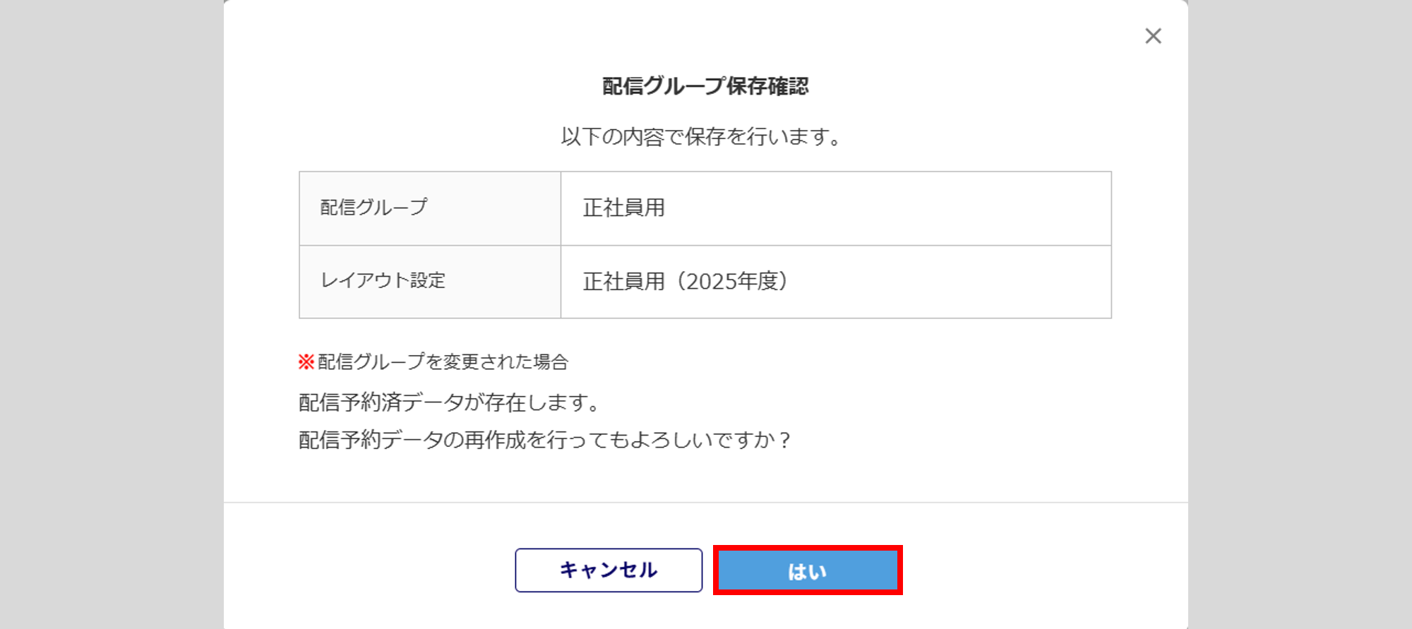 クリック後、「配信グループ保存確認」画面が表示されます。