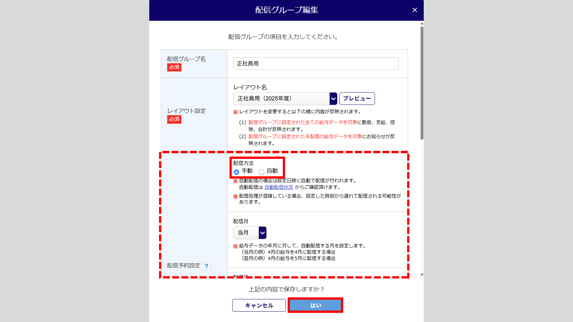 「配信予約設定」の「配信方法」に「手動」を選択し、[はい]をクリックします。
