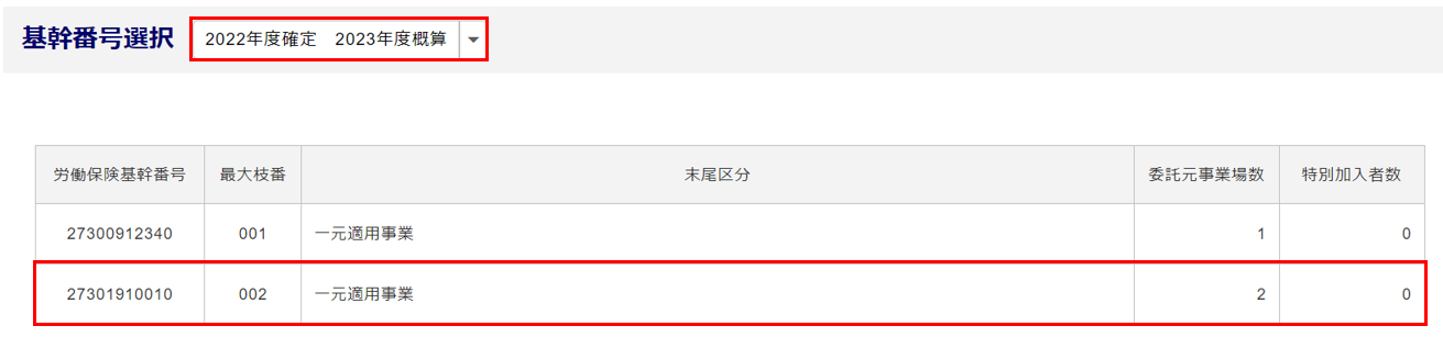 「対象年度」を選択し、対象の労働保険基幹番号の行をクリックします。