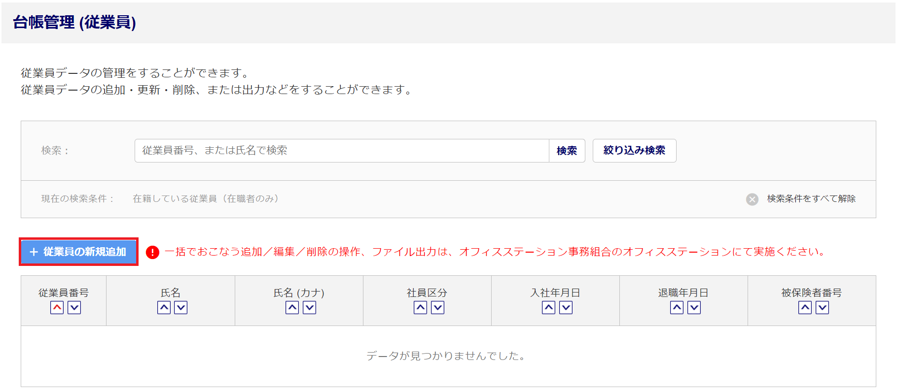 事務組合画面から、従業員情報を一括で追加することはできません。