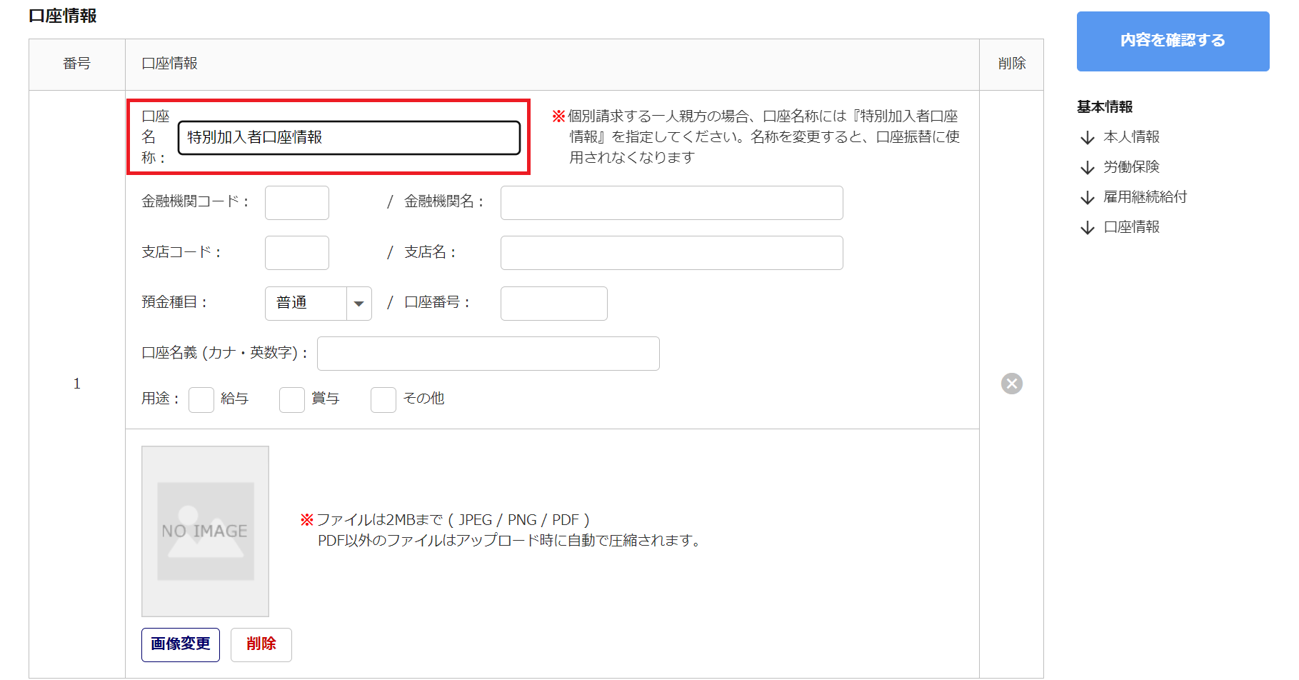 個別請求する一人親方の場合、「口座名称」へ「特別加入者口座情報」と入力し、金融機関の情報を設定します。