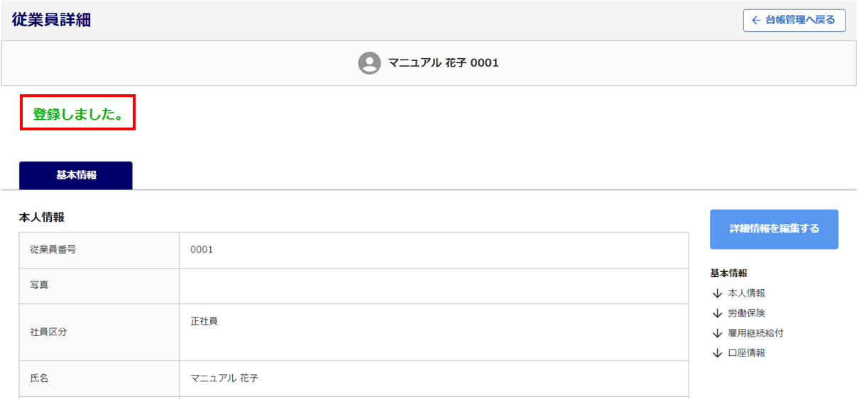 「登録しました。」と表示されたら、従業員情報の追加は完了です。
