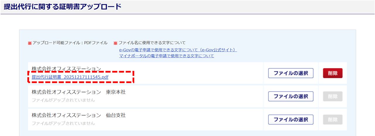 ・提出代行証明書にアップロード可能なファイルは、PDFファイルのみです。