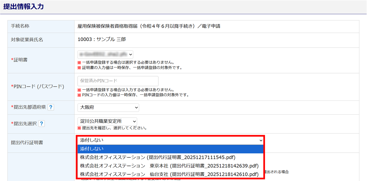 設定した提出代行証明書は、電子申請の「提出情報入力」画面にて、自動で添付されます。