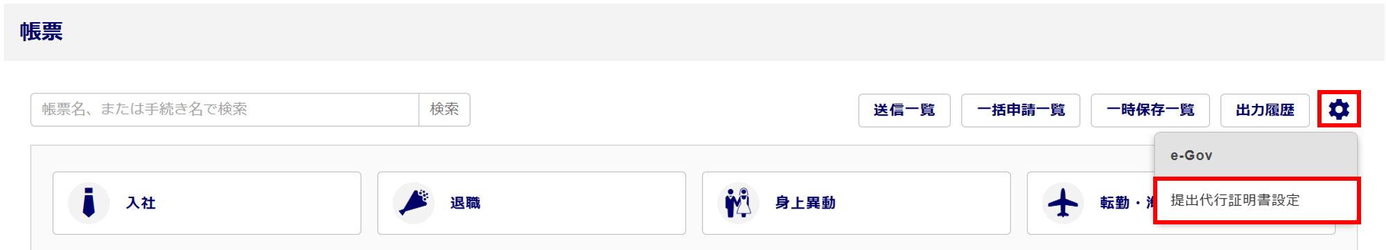 をクリックし、表示されるメニュー内の[提出代行証明書設定]をクリックします。