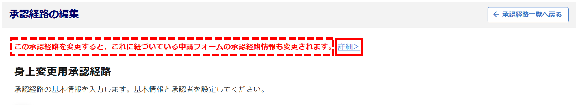 編集する承認経路が、申請フォームに紐付け設定している場合、下図のメッセージが画面上部に表示されます。[詳細>]をクリックすると、紐づけ設定している申請フォームを確認できます。