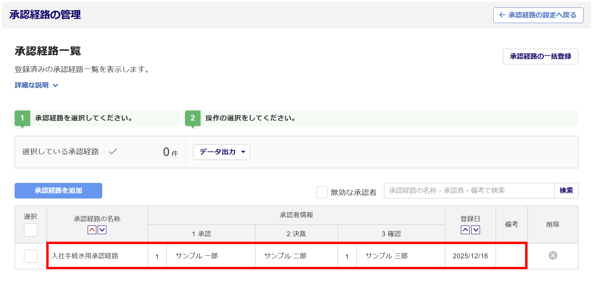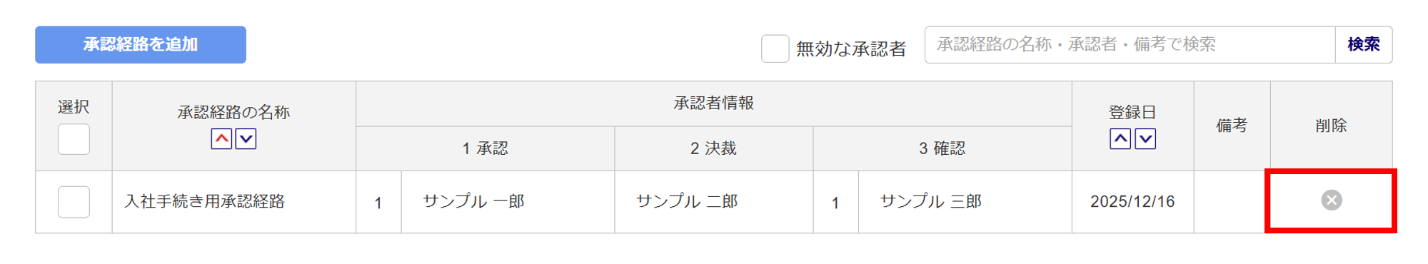 登録済みの承認経路を削除する場合は、対象の承認経路の「削除」列の[