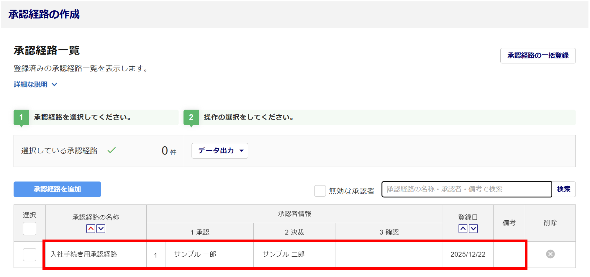 登録済みの承認経路を削除する場合は、対象の承認経路の「削除」列の[ ]をクリックします。