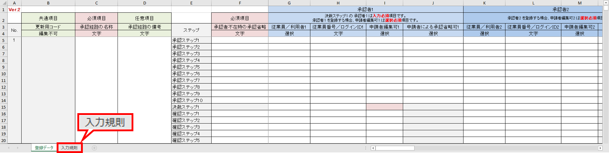 ダウンロードしたテンプレートファイルを開き、「入力規則」にしたがって、承認経路情報を入力します。