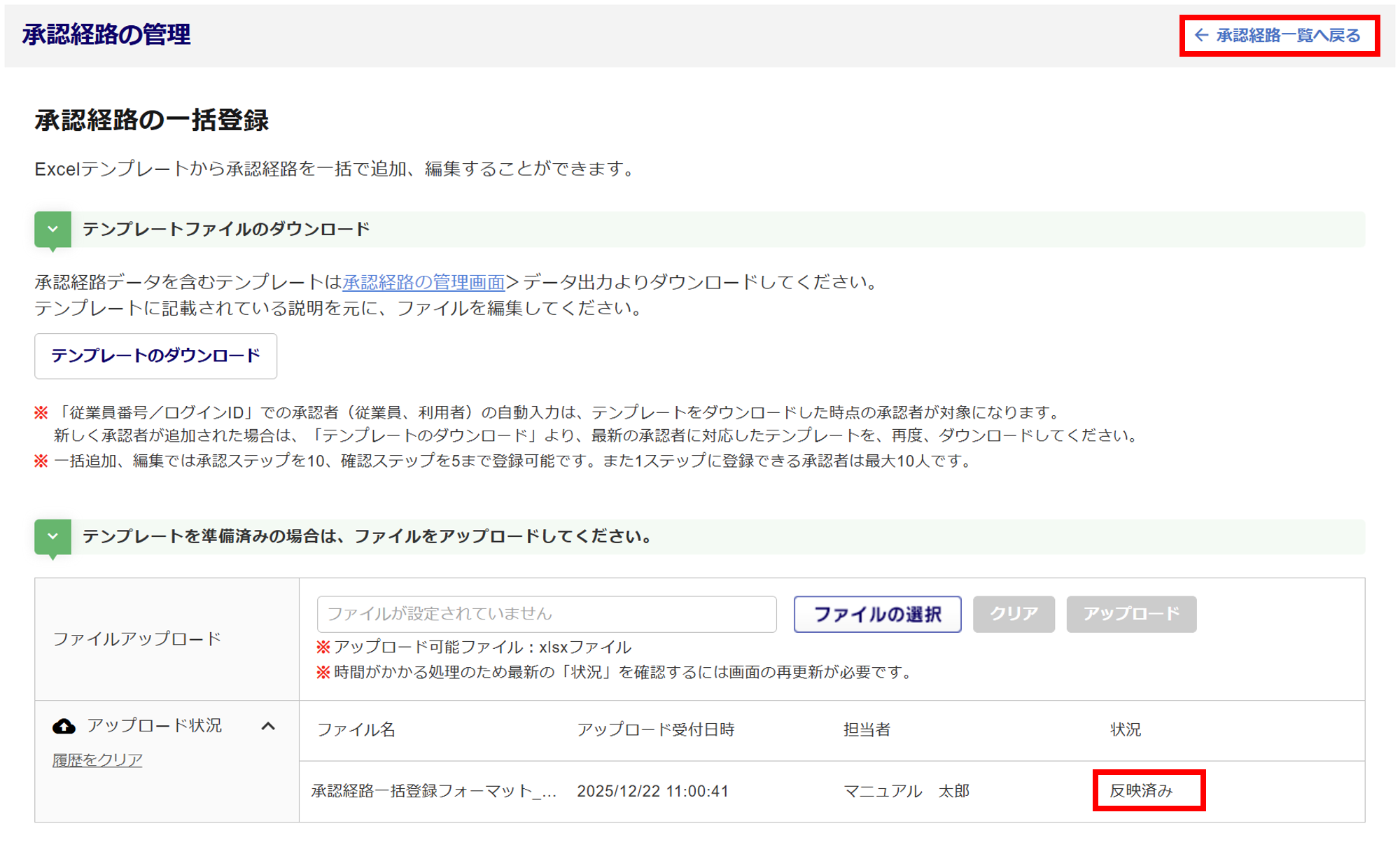「アップロード状況」欄の「状況」が「反映済み」と表示されたら、承認経路の一括登録は完了です。