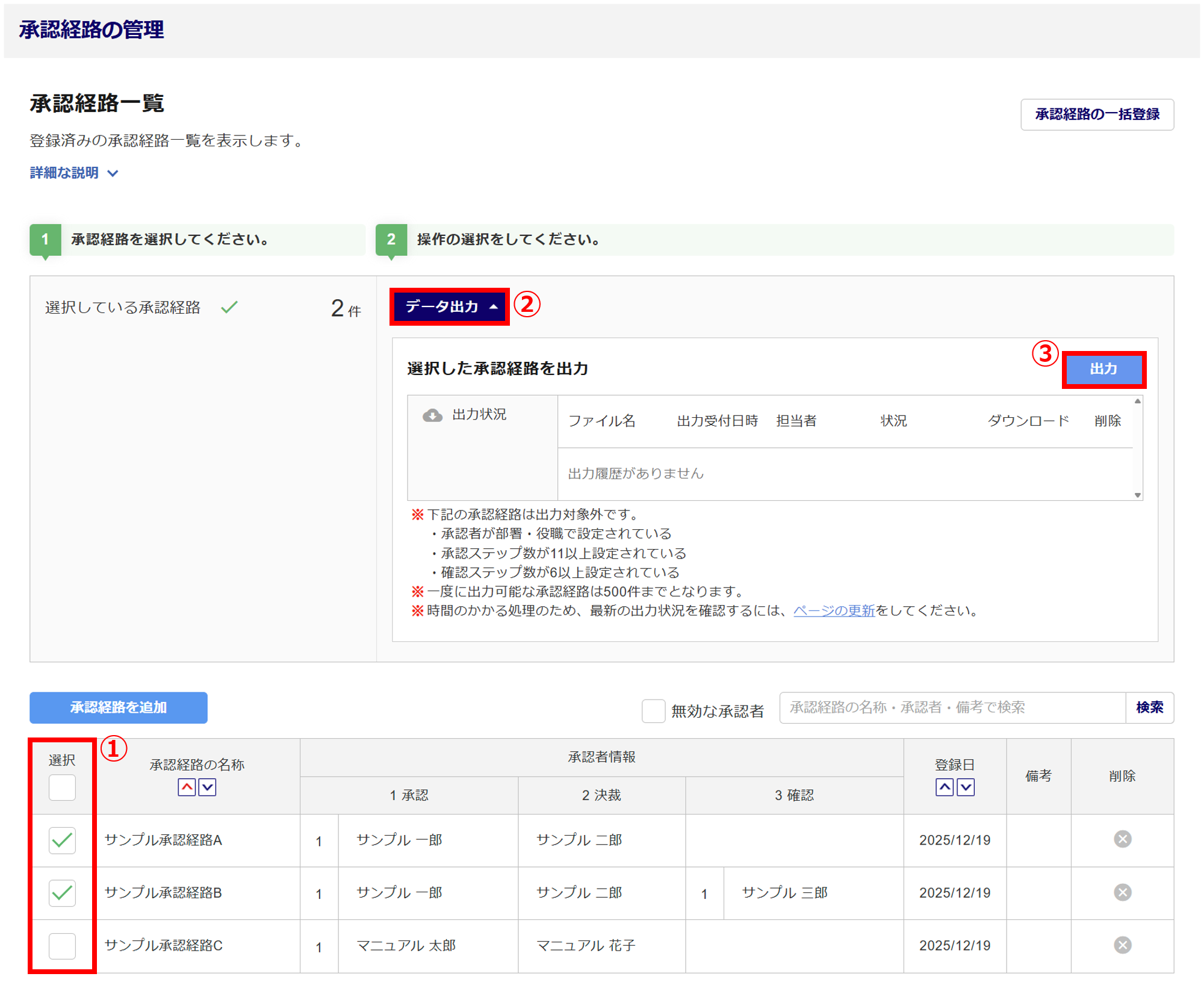 出力する承認経路の「選択」列(①)にチェックし、[データ出力](②)>[出力](③)をクリックします。
