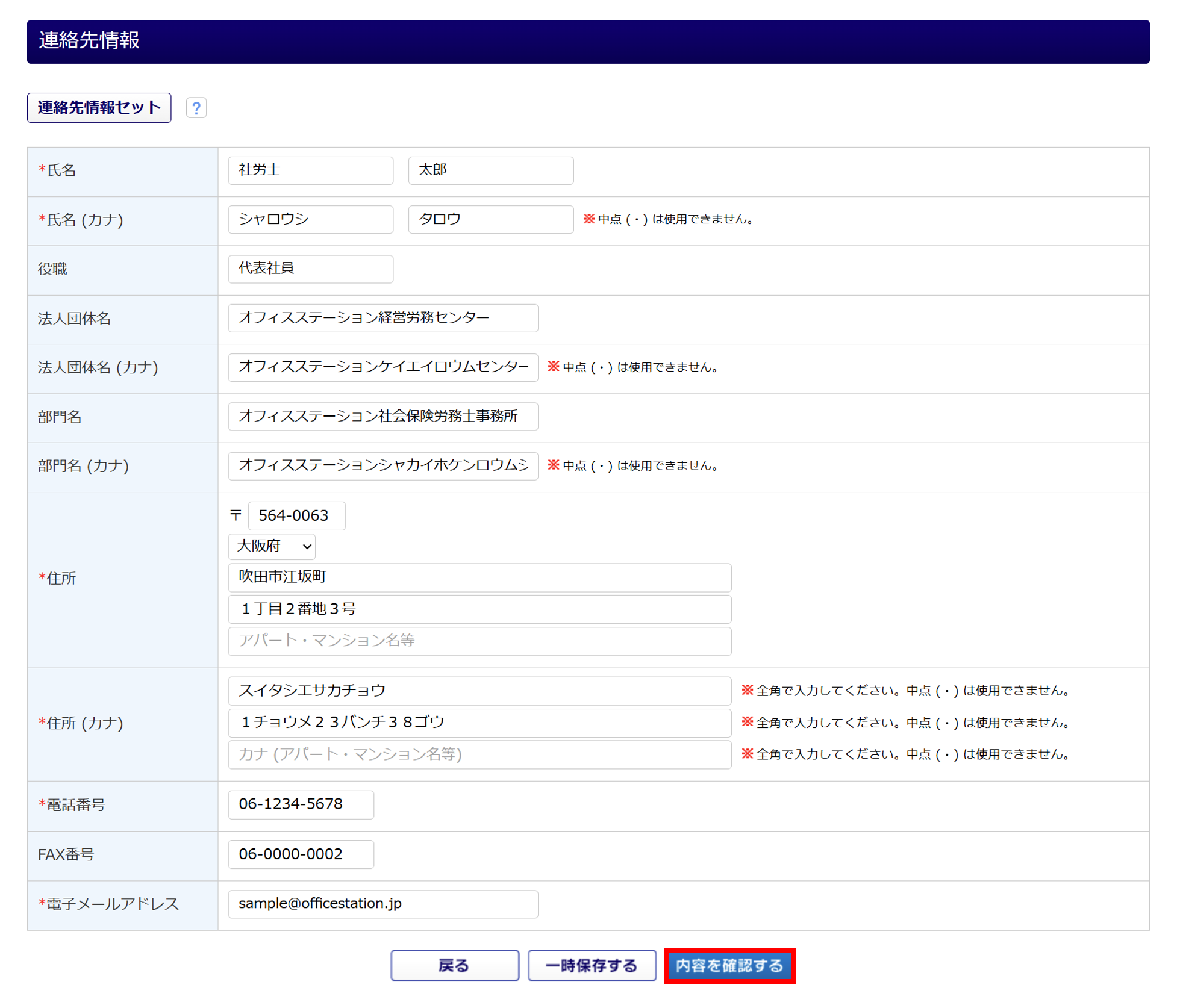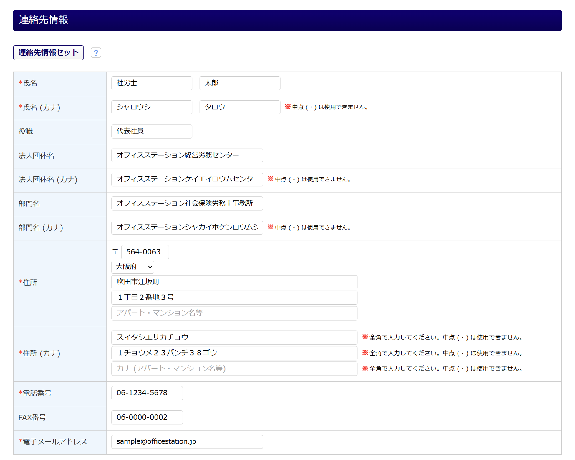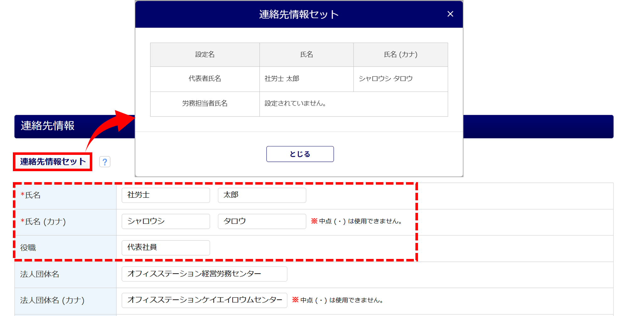 [連絡先情報セット]をクリックすると、「氏名」「氏名 (カナ)」「役職」項目に引用する「事務組合設定」の情報が表示されます。