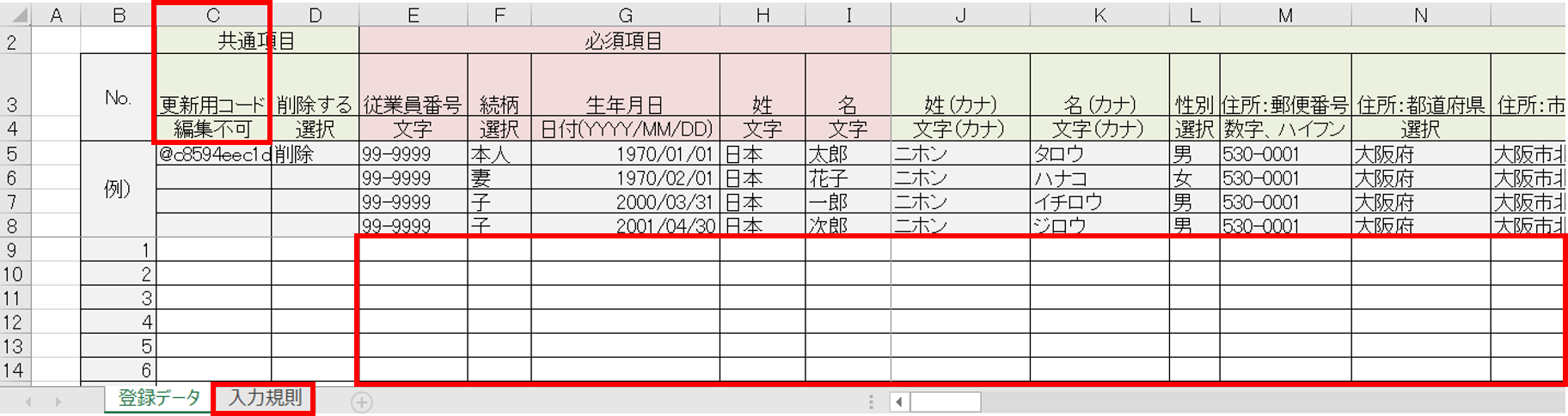 ・項目名の編集や列、行の削除は、エラーの原因となるためおこなわないでください。