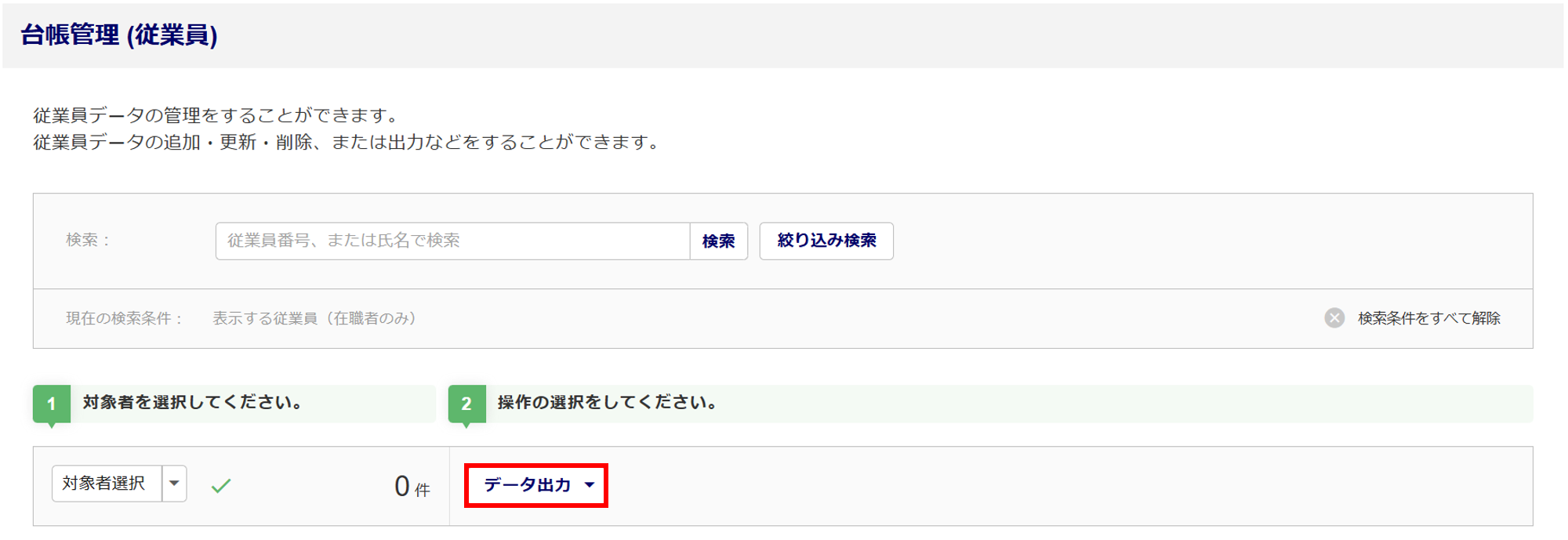 ファイル名は、「台帳情報一括出力_yyyymmdd_hhmmss.xlsx」で出力します。 - 従業員データがセットされていないテンプレートをダウンロードする場合