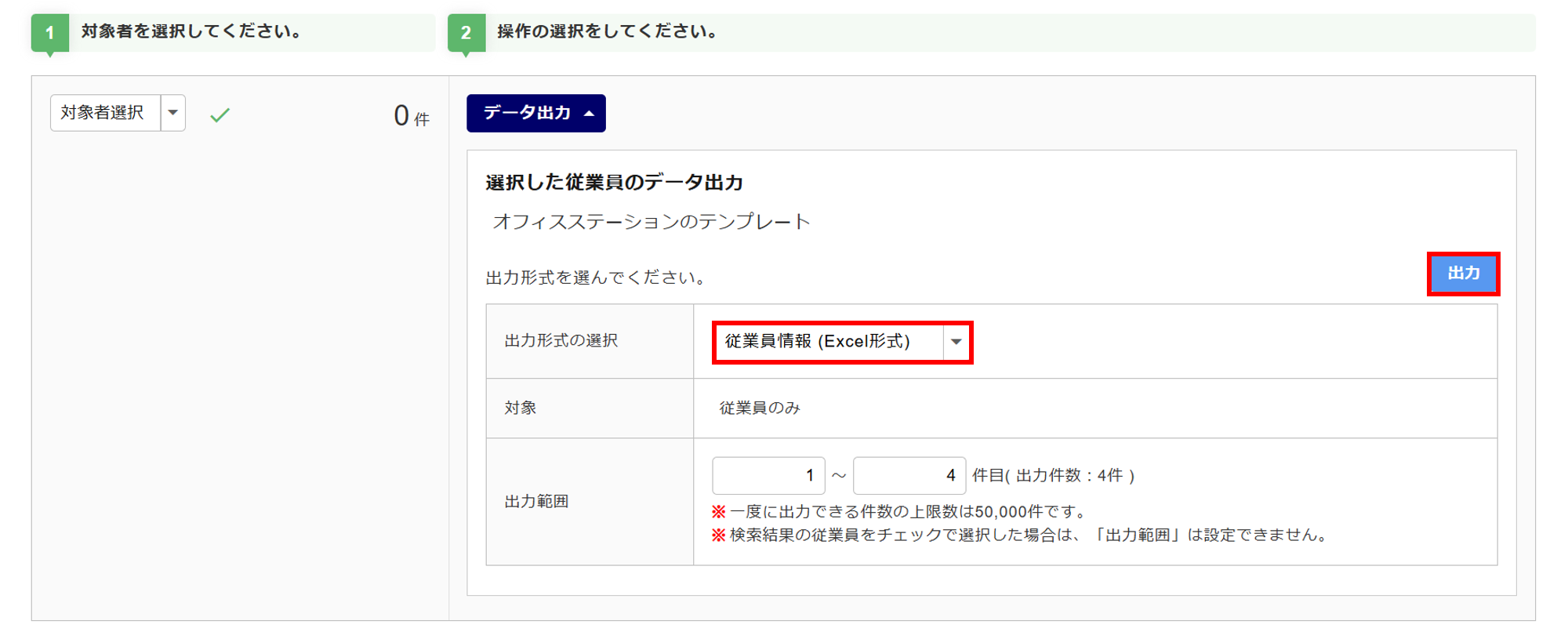 「出力形式の選択」に「従業員情報 (Excel形式)」を選択し、[出力]をクリックします。