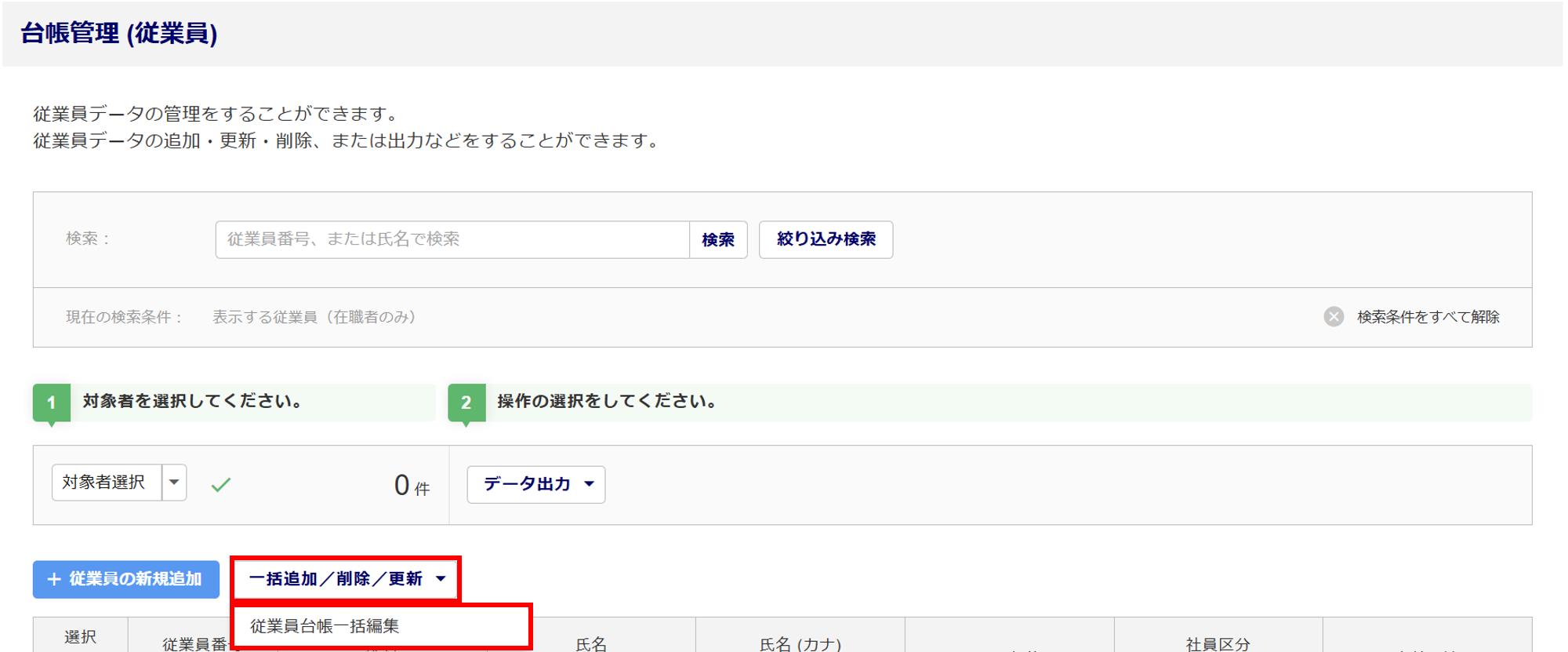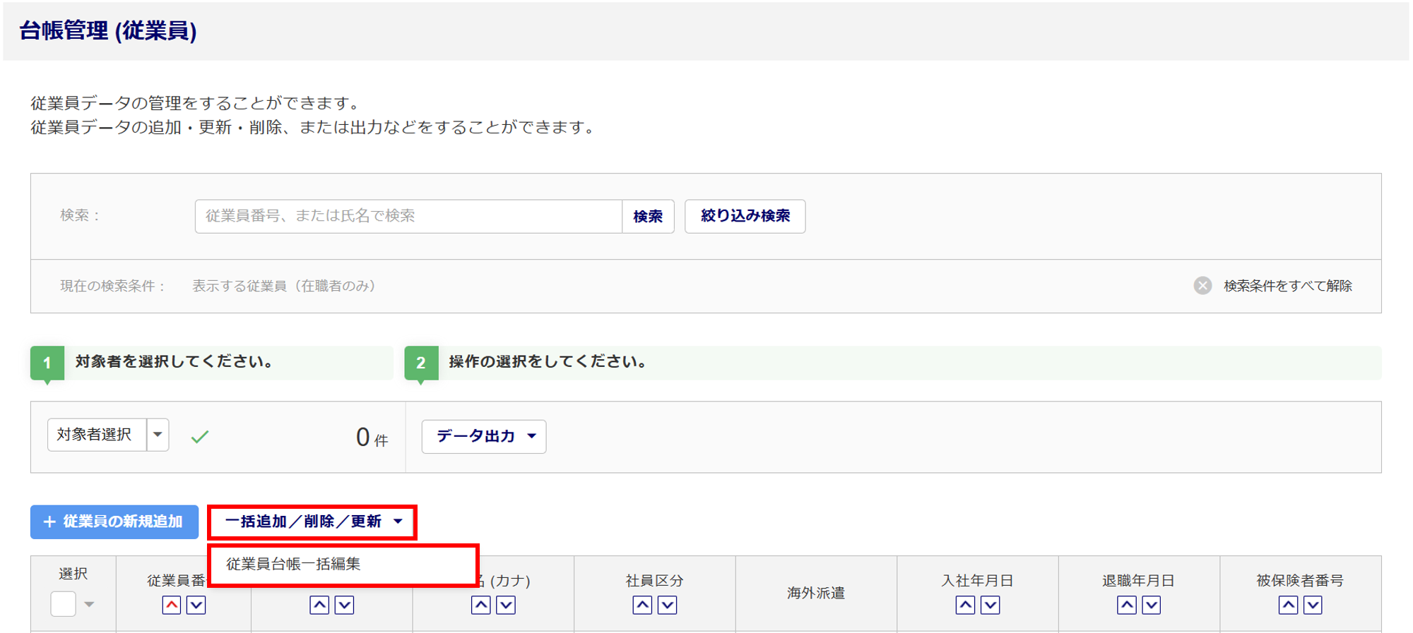 [一括追加/削除/更新]をクリックし、表示されるメニュー内の[従業員台帳一括編集]をクリックします。