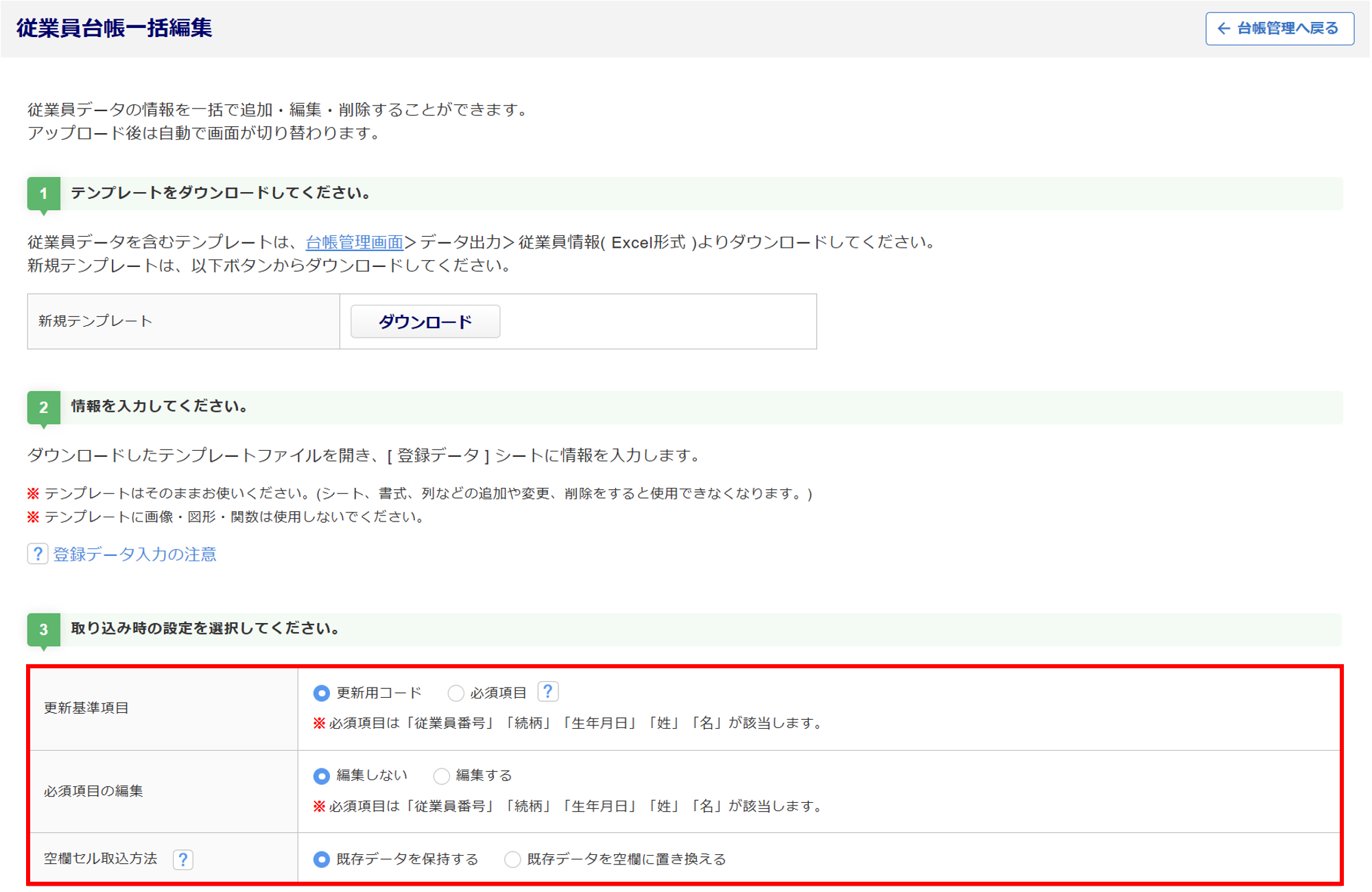 | 空欄セル取込方法 | Excelファイルに空欄セルがある場合の取込方法を設定します。 ・既存データを保持する 従業員台帳に登録している情報を保持して、更新します。 ・既存データを空欄に置き換える 従業員台帳に登録している情報を空欄にして、更新します。 |