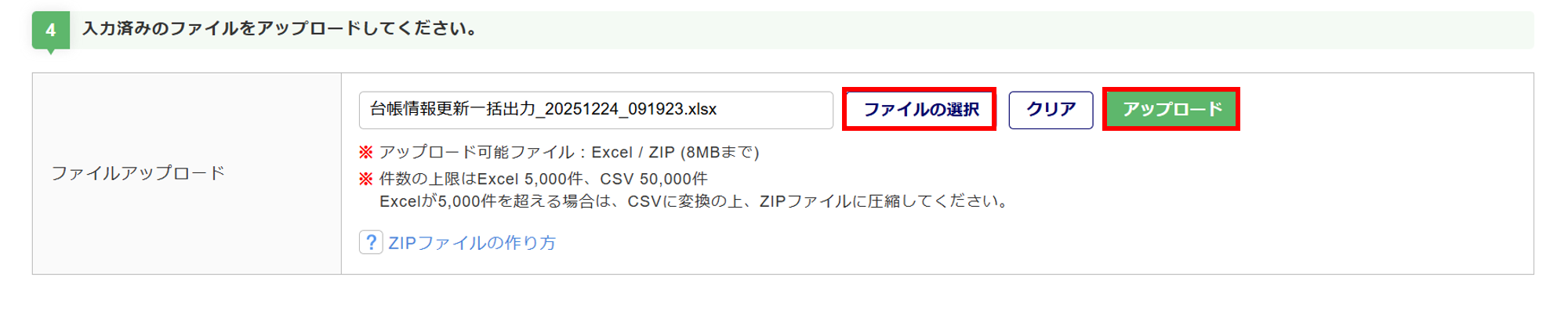 保存したExcelファイルを選択し、[アップロード]をクリックします。