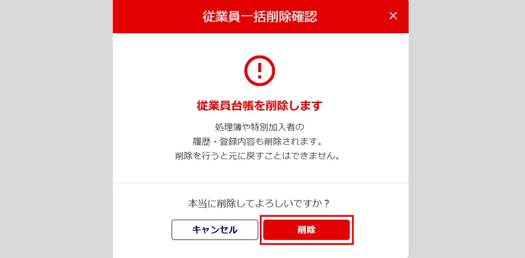 削除をおこなう場合は、「従業員一括削除確認」ウィンドウが表示されます。
