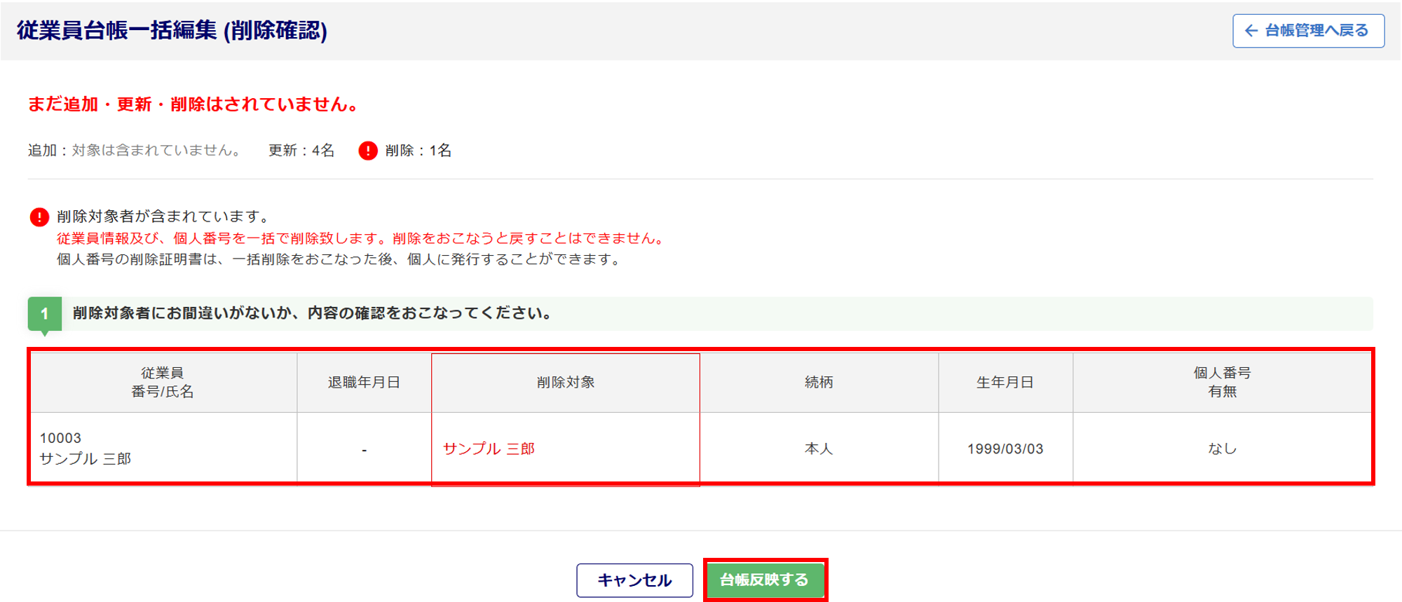 「従業員台帳一括編集(削除確認)」画面が表示されます。