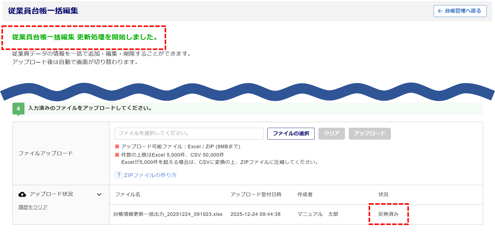画面左上に「従業員台帳一括編集 更新処理を開始しました。」と表示され、アップロードが開始されます。アップロード状況は、画面下部の「状況」から確認することができます。