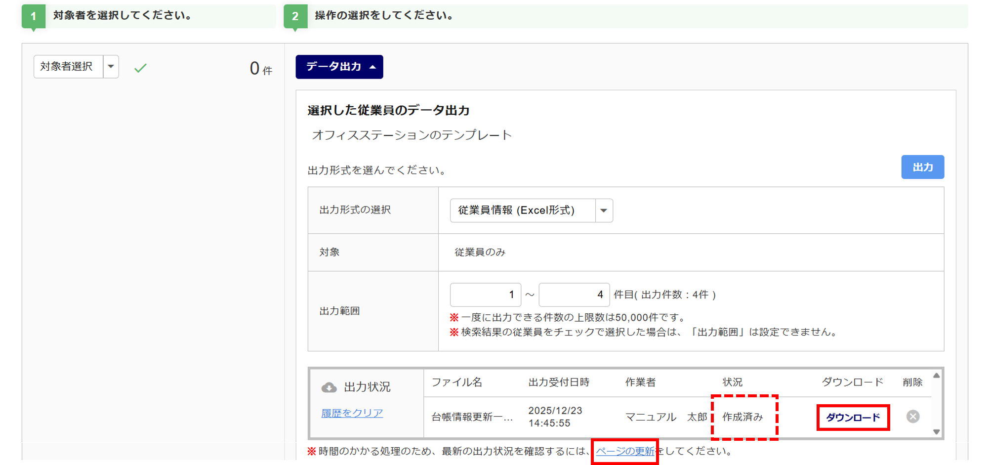 ※出力処理に時間がかかるため、最新の「状況」を確認するには、[ページの更新]をクリックしてください。