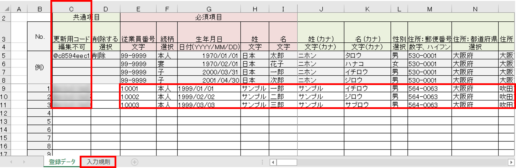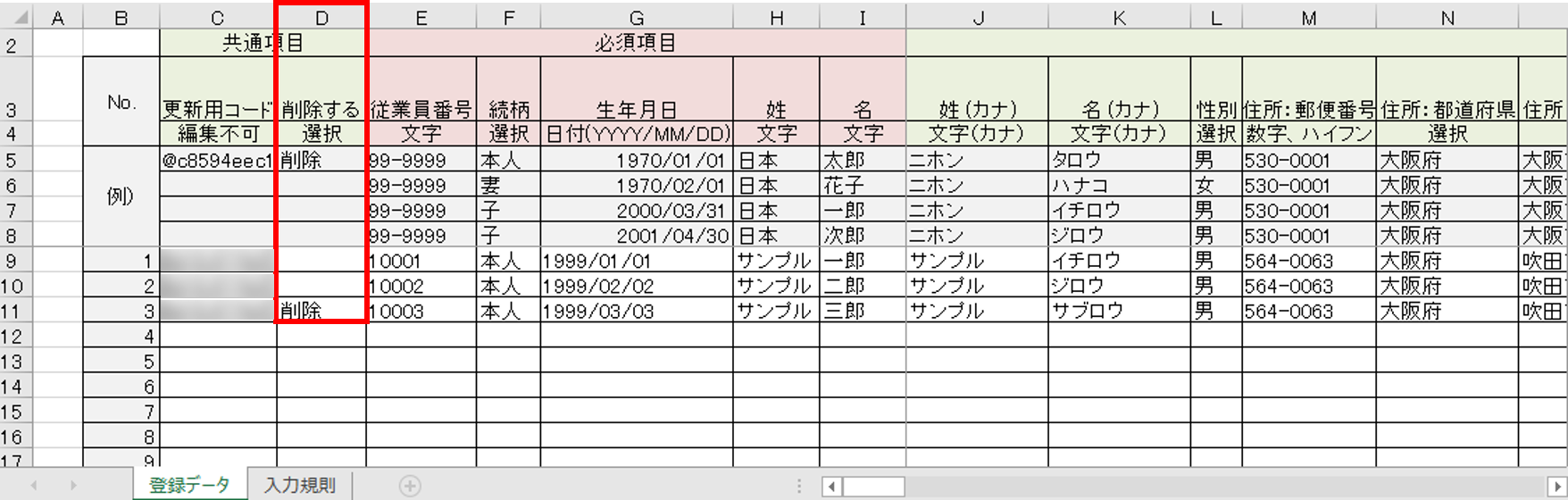 ※従業員の新規追加の場合、更新用コードは空白でアップロードします。