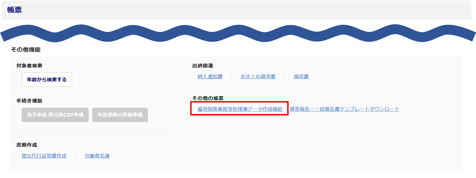 画面下部の「その他機能」欄にある[雇用保険事務等処理簿データ作成機能]をクリックします。