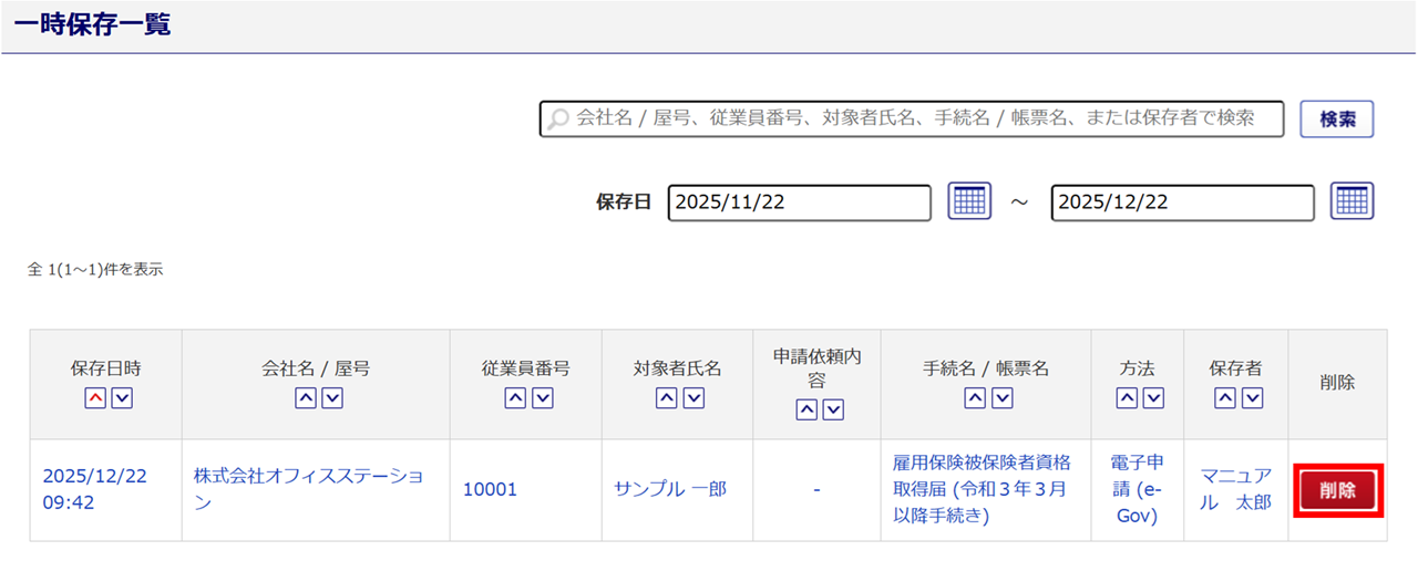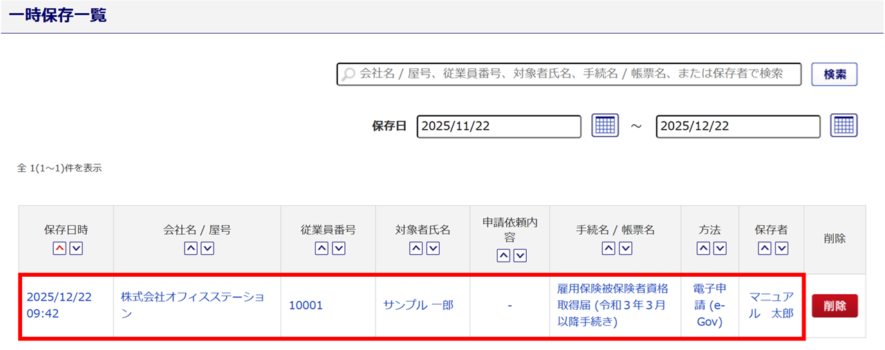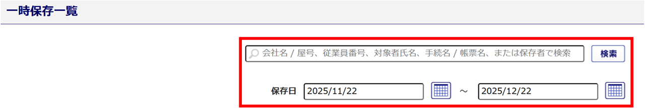 初期表示では、「保存日」が本日より1カ月前からの一時保存した手続きが一覧に表示されます。