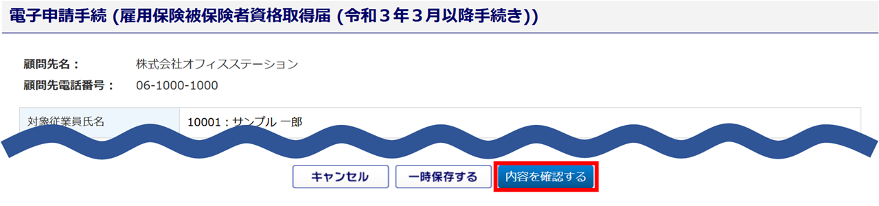 一時保存した内容を編集後、[内容を確認する]をクリックし、「提出情報入力」画面まで進めると、一括申請登録および電子申請*がおこなえます。