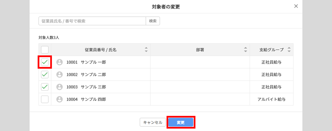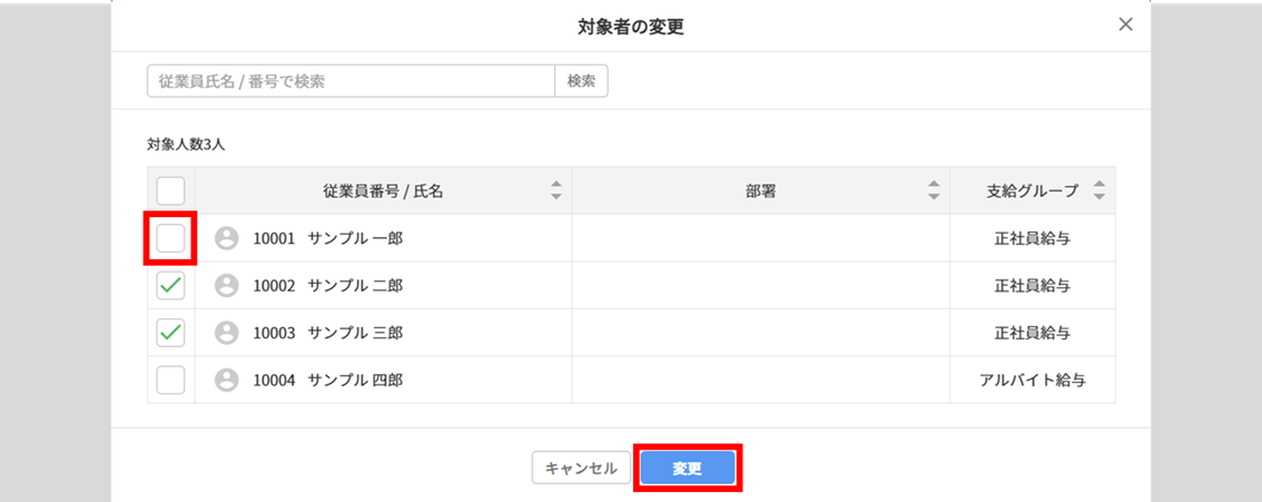 先ほど、対象者から外した従業員にチェックし、[変更]をクリックします。