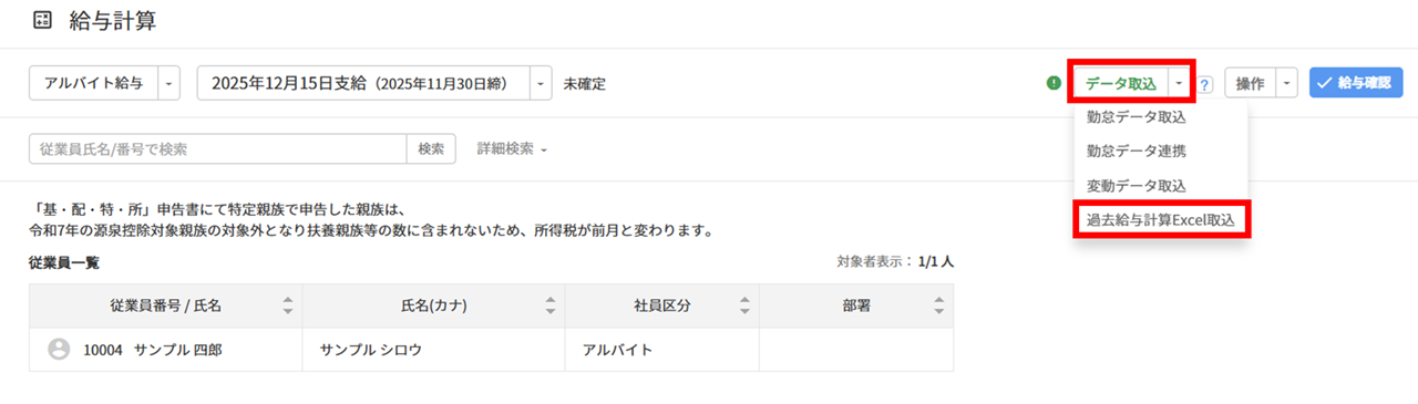 [データ取込]>[過去給与計算Excel取込]をクリックします。