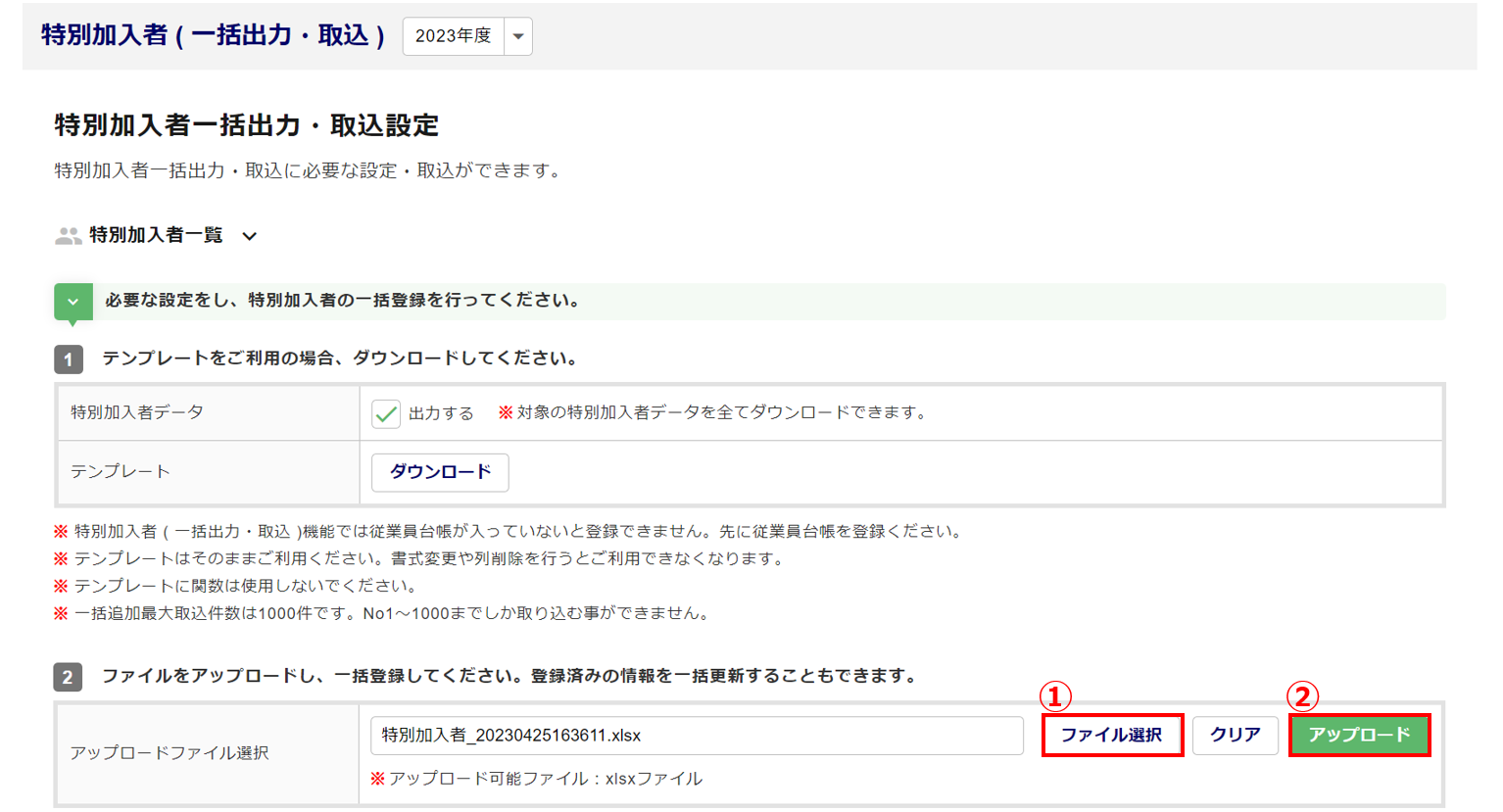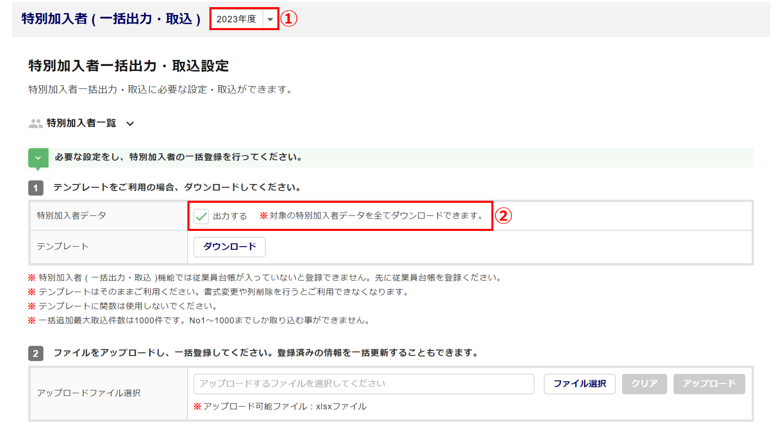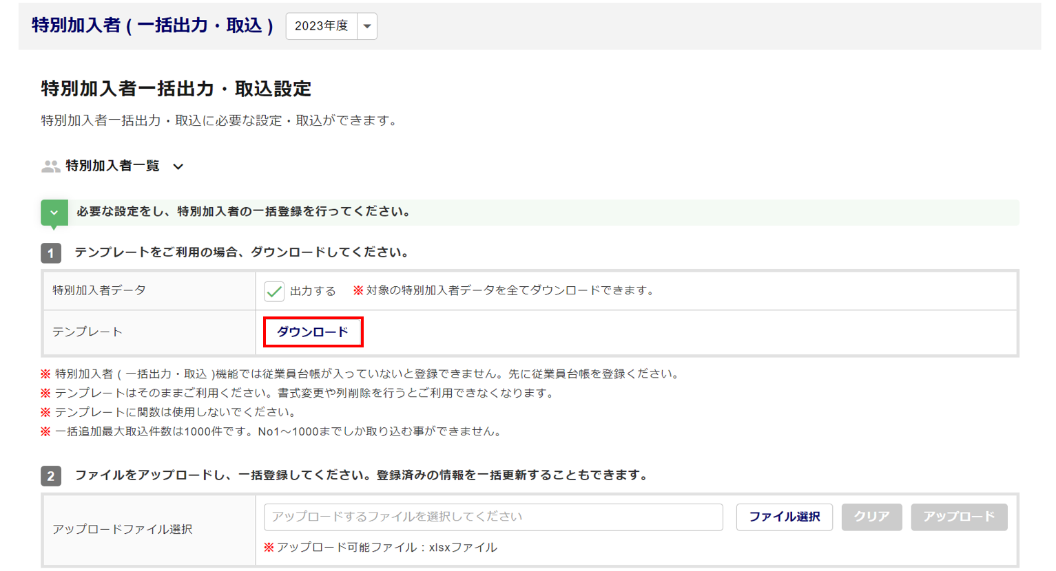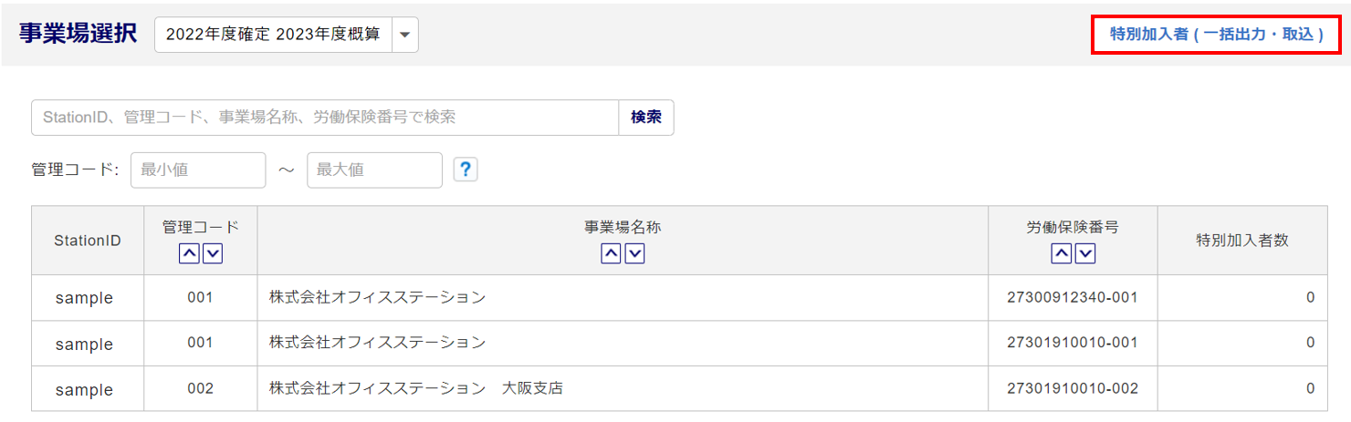 特別加入者(一括出力・取込)の登録