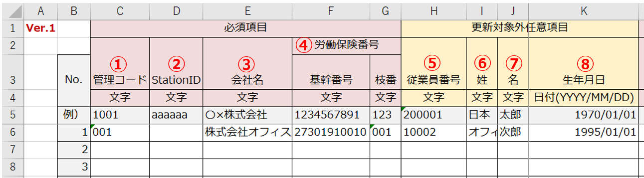 ・テンプレートの「①管理コード」「➁StationID」列に「必須項目」と表記していますが、