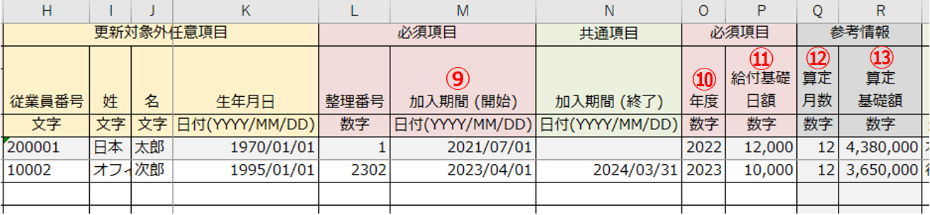加入期間(開始) 対象年度の途中に加入した場合などに、「⑫算定月数」や「⑬算定基礎額」の算出時にも利用します。