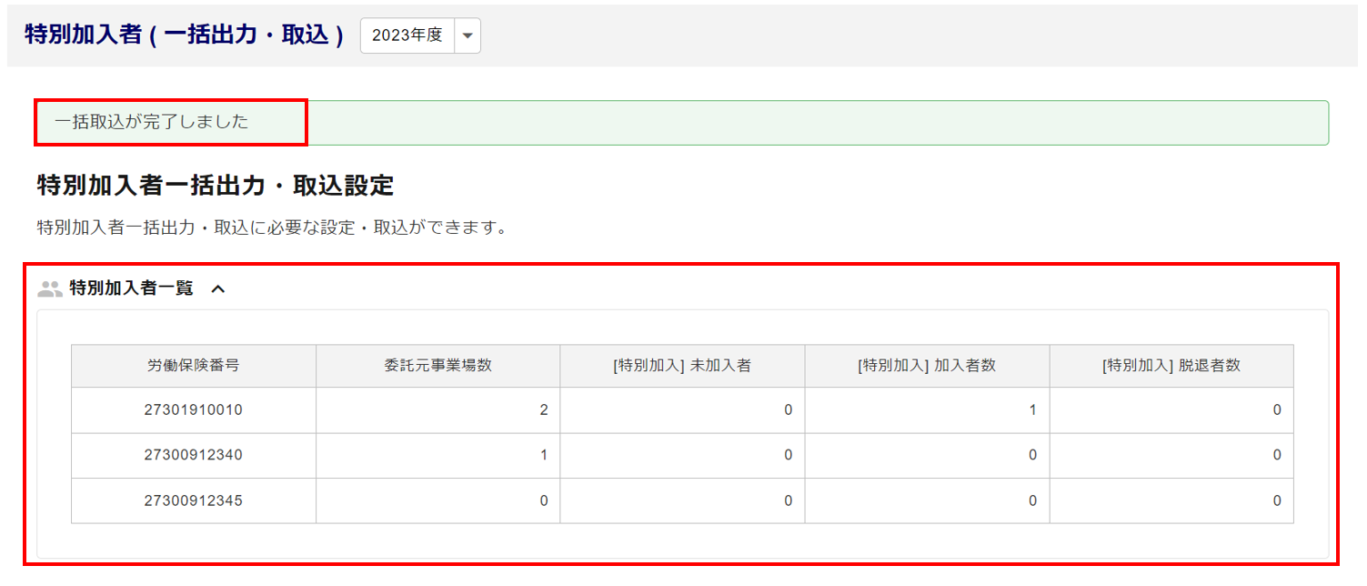 「一括取込が完了しました」と表示されたら、特別加入者の一括取込は完了です。