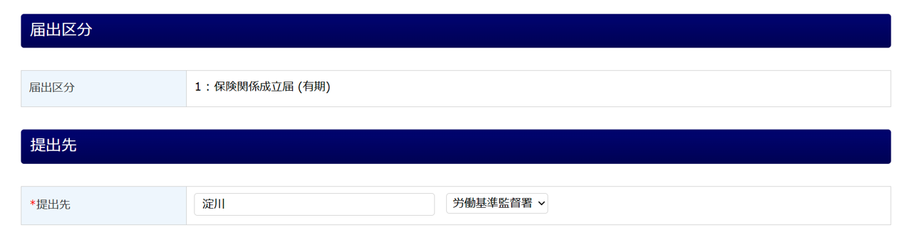 届出区分を確認し、提出先を入力および、プルダウンから選択します。