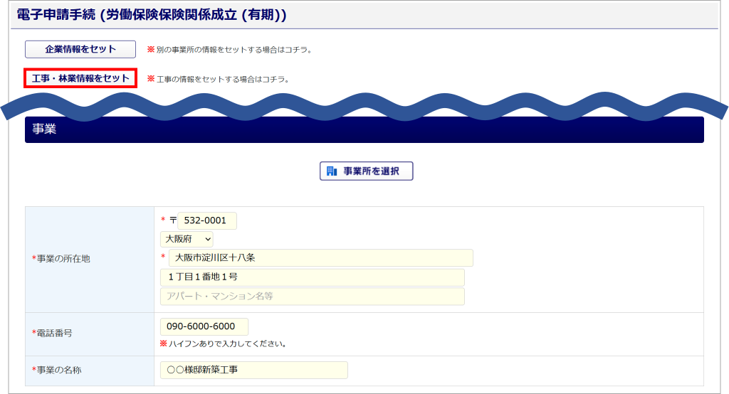 画面上部の[工事・林業情報をセット]をクリックします。