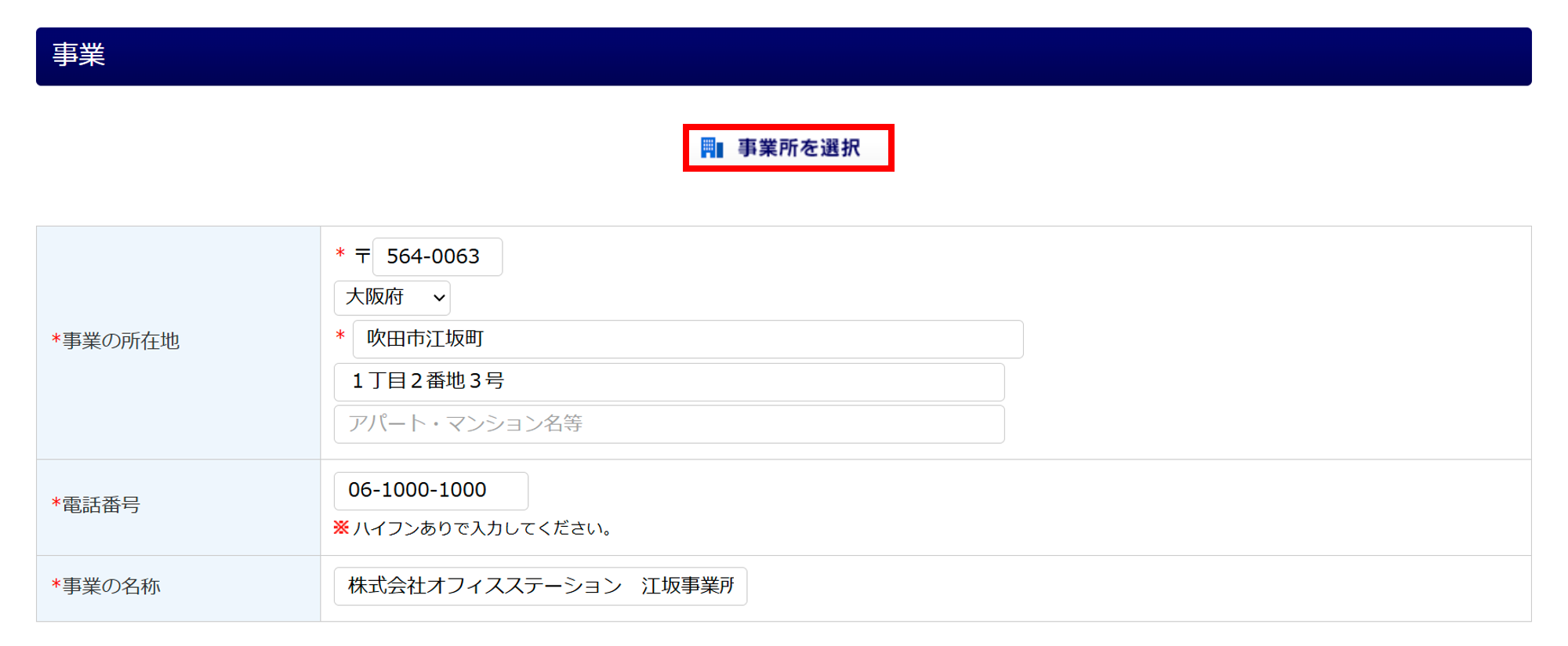※[事業所を選択]から情報を引用した場合は、入力フォーム部分が黄色になります。