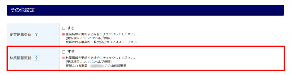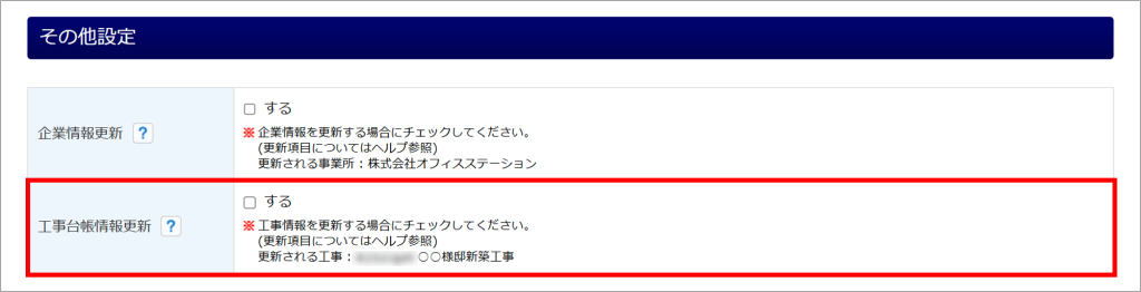 [工事・林業情報をセット]から情報を引用した場合は、「その他設定」欄に「工事台帳情報更新」または「林業情報更新」が表示されます。更新対象項目については、以下の補足をご確認ください。