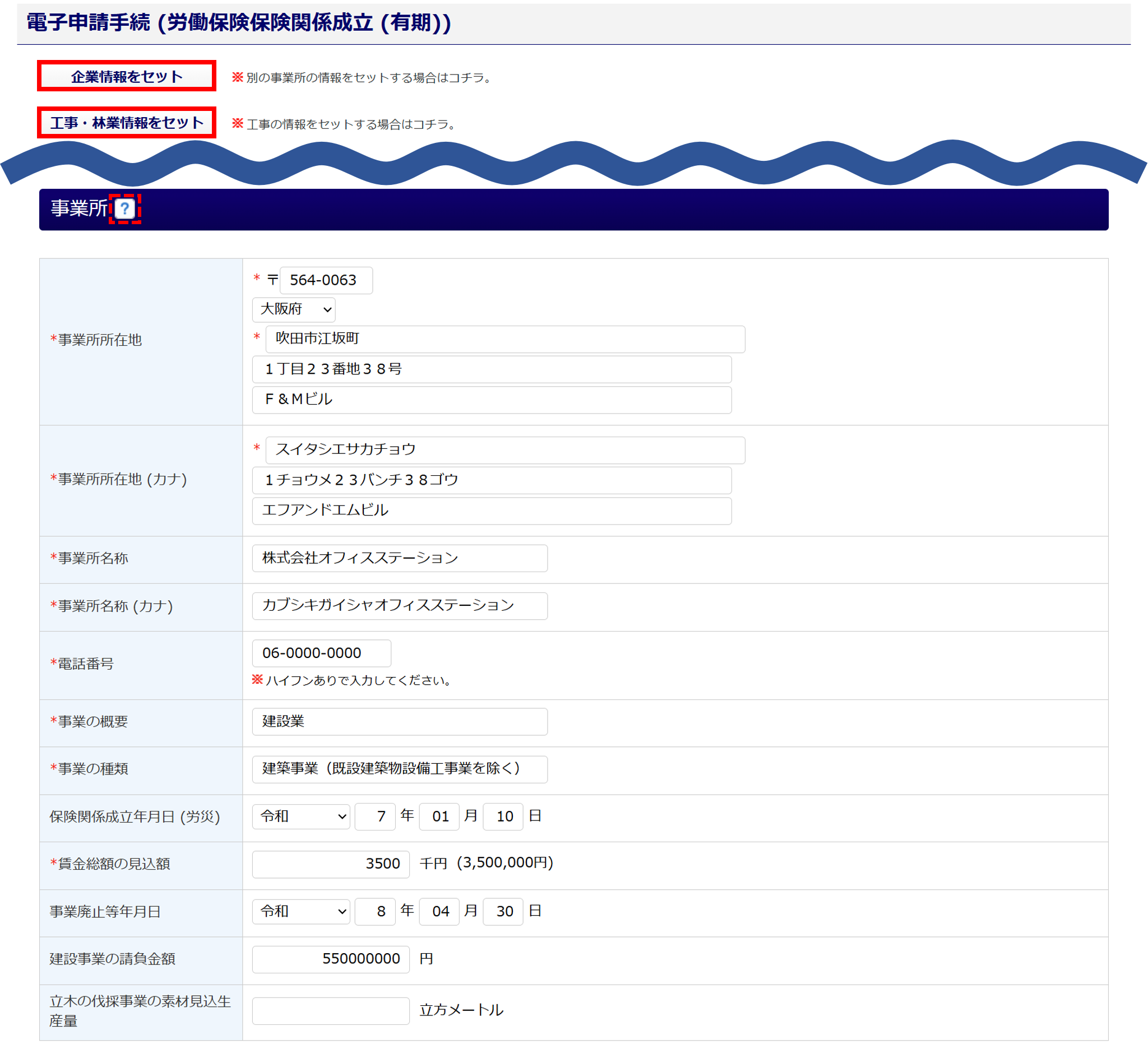 [工事・林業情報をセット]を設定した場合