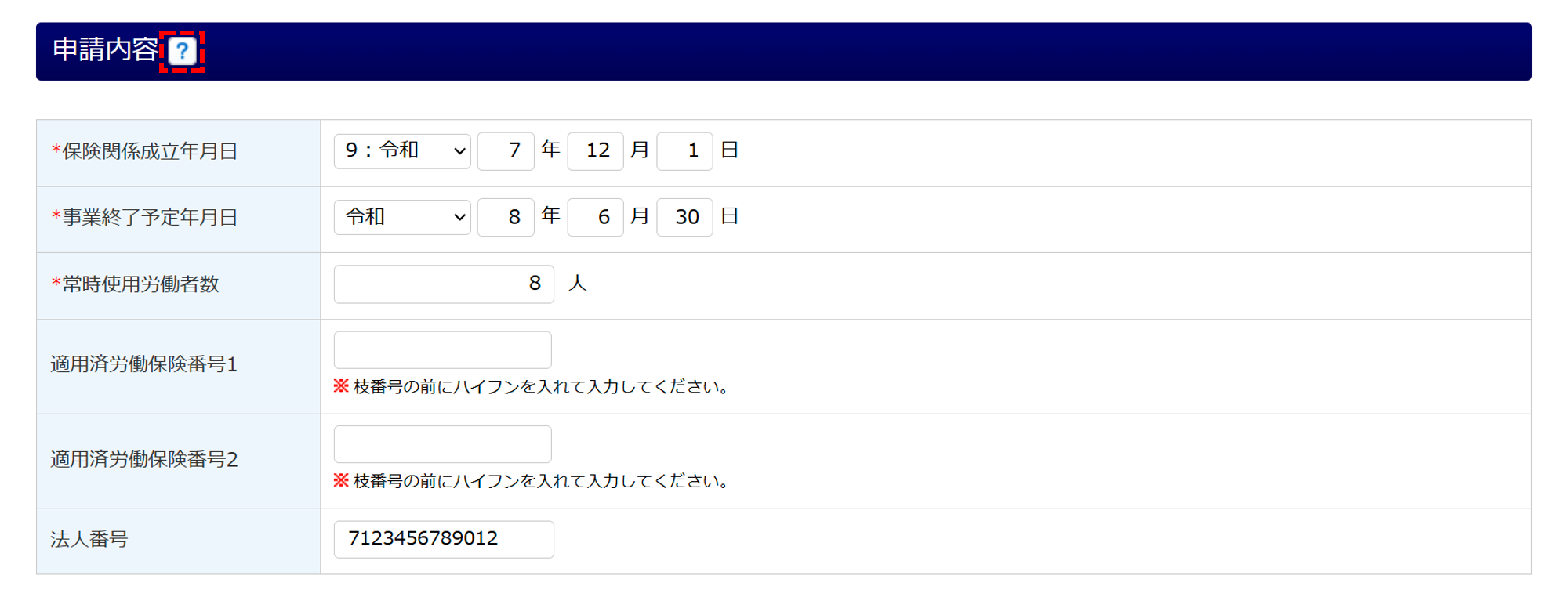 「会社名 / 屋号※1」「会社名 / 屋号 (カナ)※1」「代表者氏名※1,2,3」「代表者氏名 (カナ)※1,2,3」「住所※3」「住所 (カナ)※3」「電話番号※3」「事業区分※4」「事業の概要」「保険関係成立区分」「保険関係成立年月日 (労災)」「法人番号」