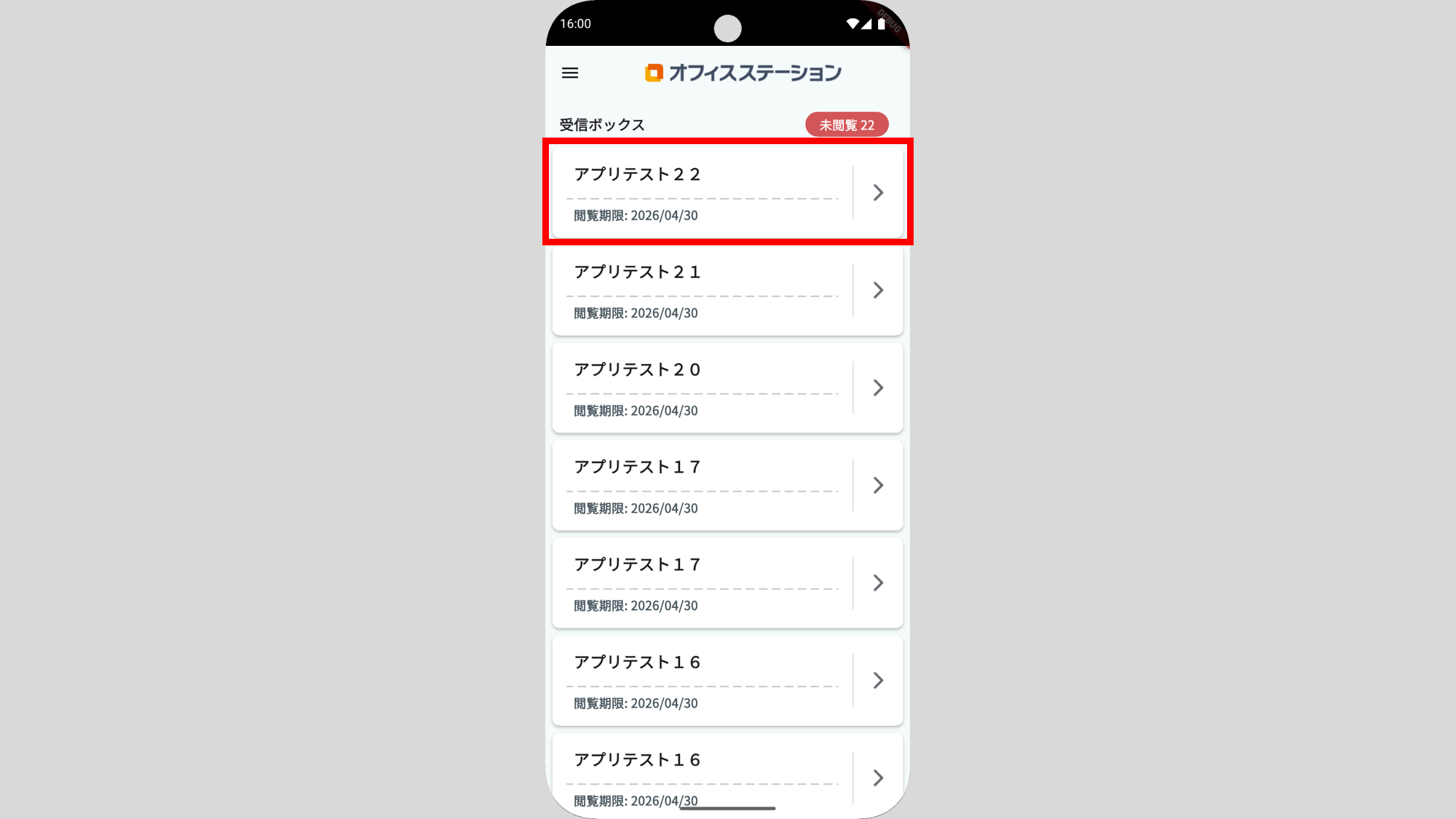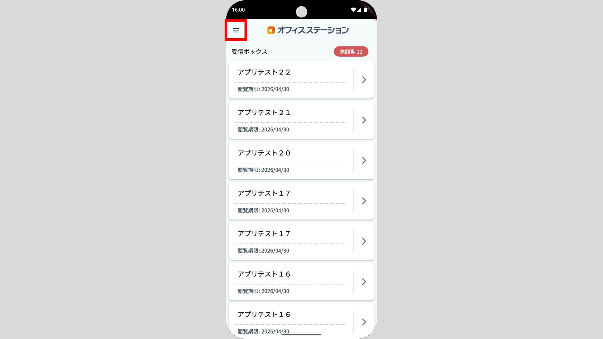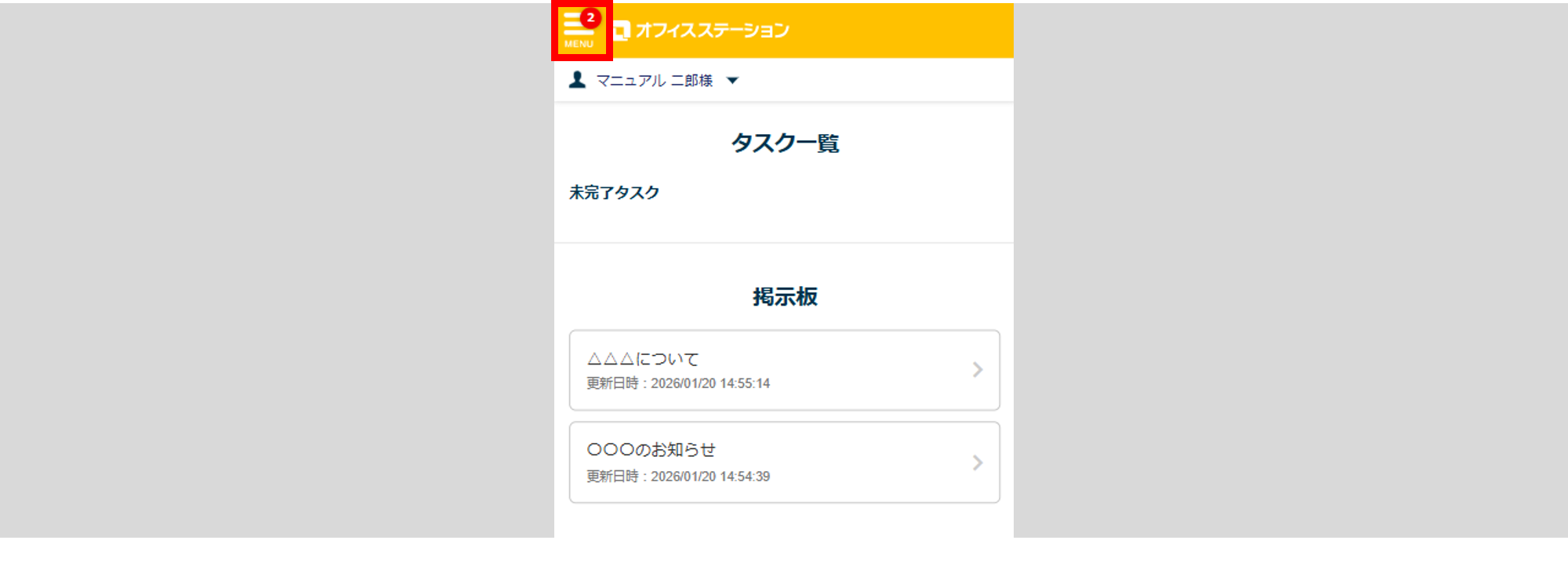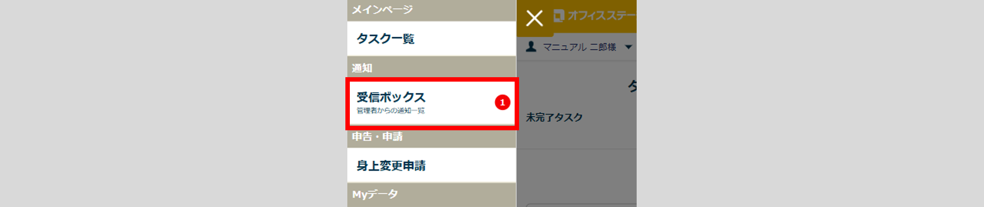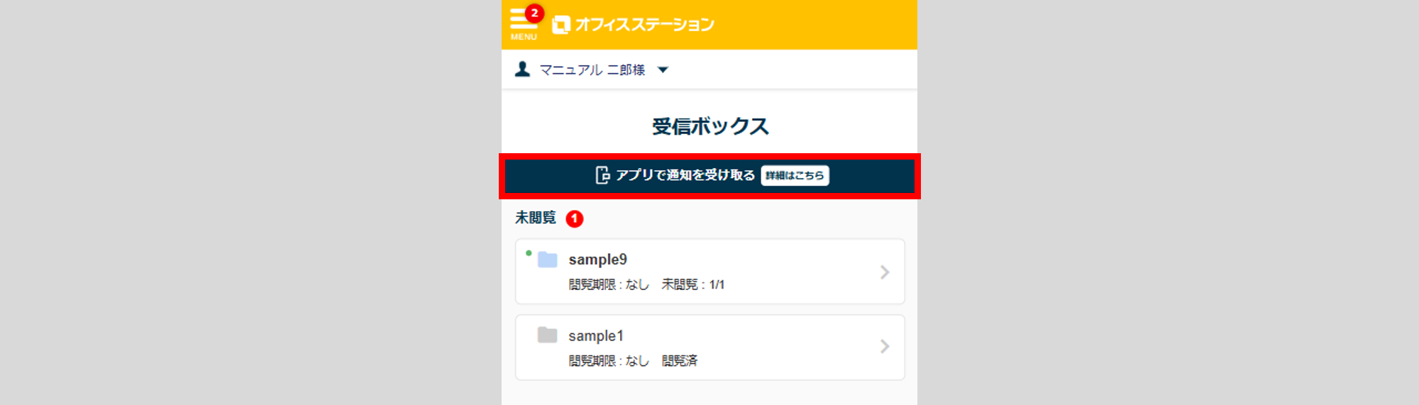 ログインが完了後、受信ボックスの通知一覧画面が表示されます。