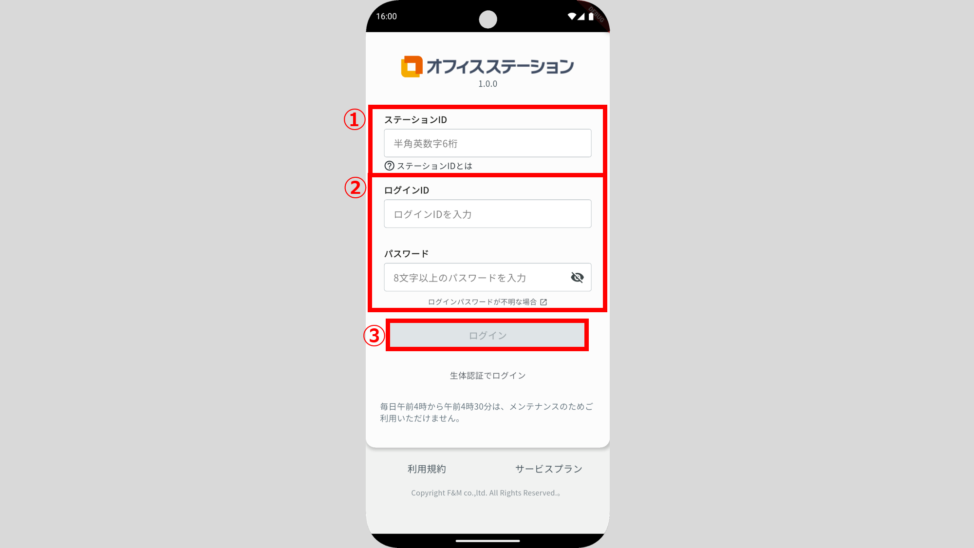 STEP1でコピーしたステーションIDを貼り付け(①)>ブラウザへのログイン時と同じログインID、パスワードを入力(②)>[ログイン](③)をクリックしてください。