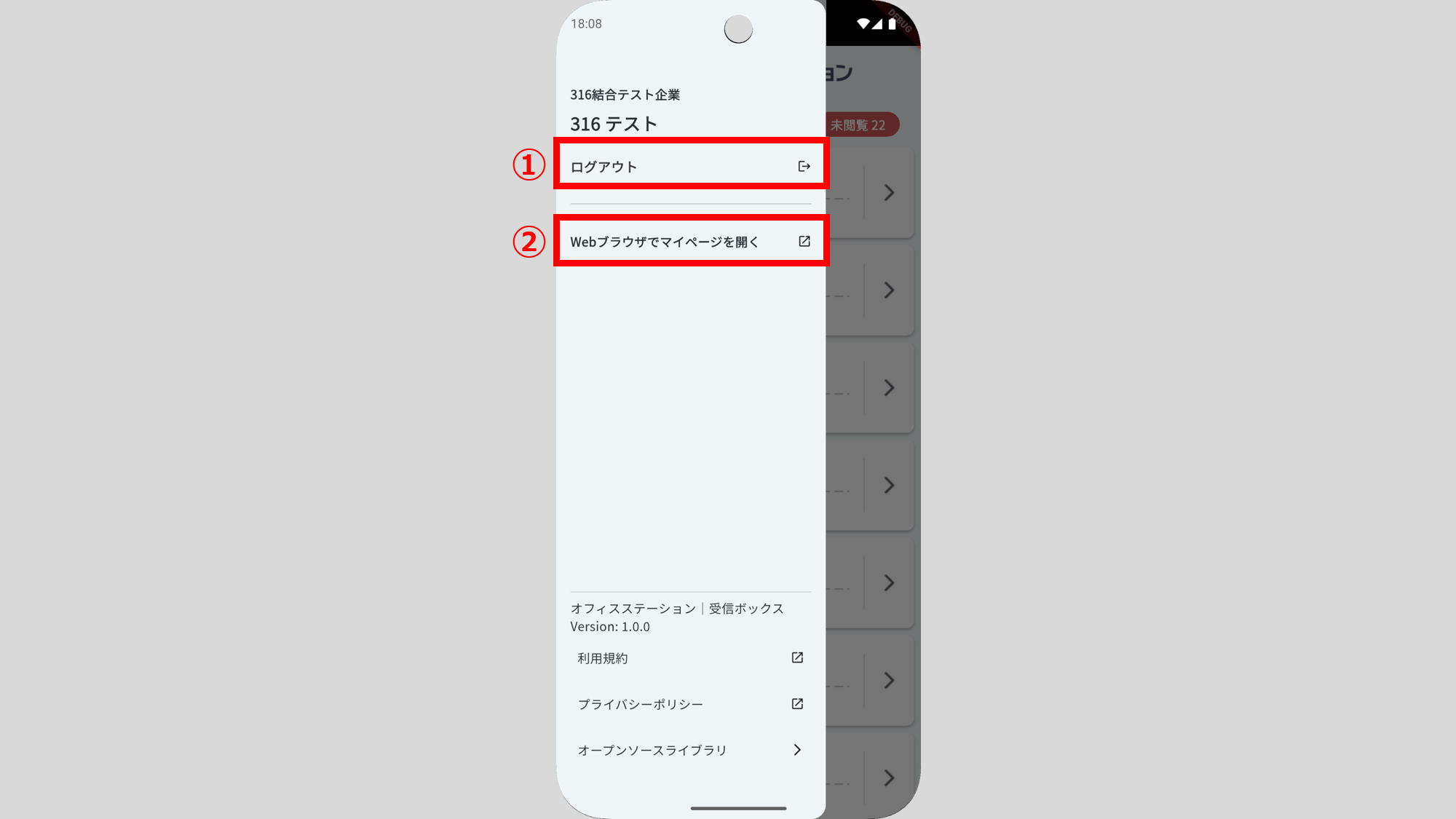 [Webブラウザでマイページを開く](②)をクリックすると、スマートフォン端末の標準ブラウザ(SafariやGoogle Chrome)でマイページに遷移します。