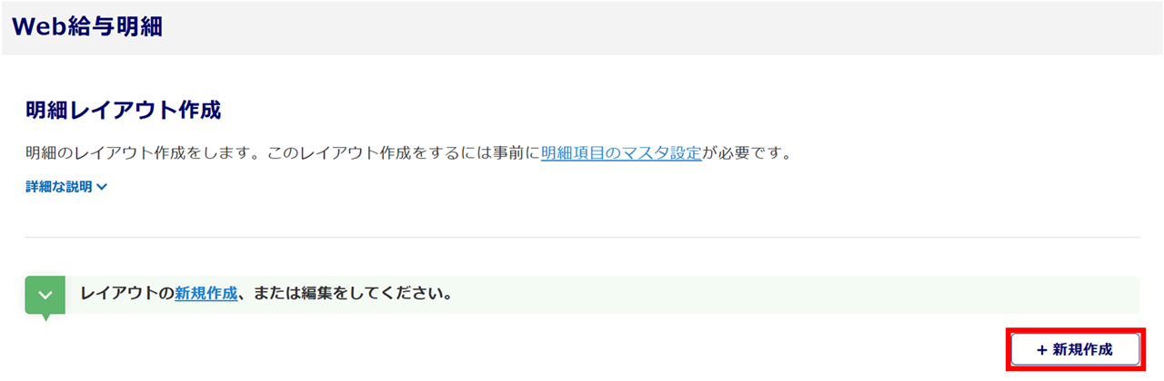 [Web給与明細]>[事前準備]>[明細レイアウト作成]をクリックします。