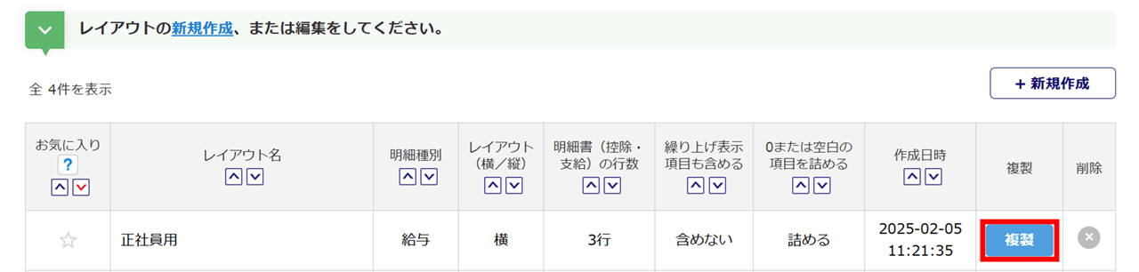 「複製」列の[複製]をクリックすると、既存のレイアウトを利用して新規作成が可能です。