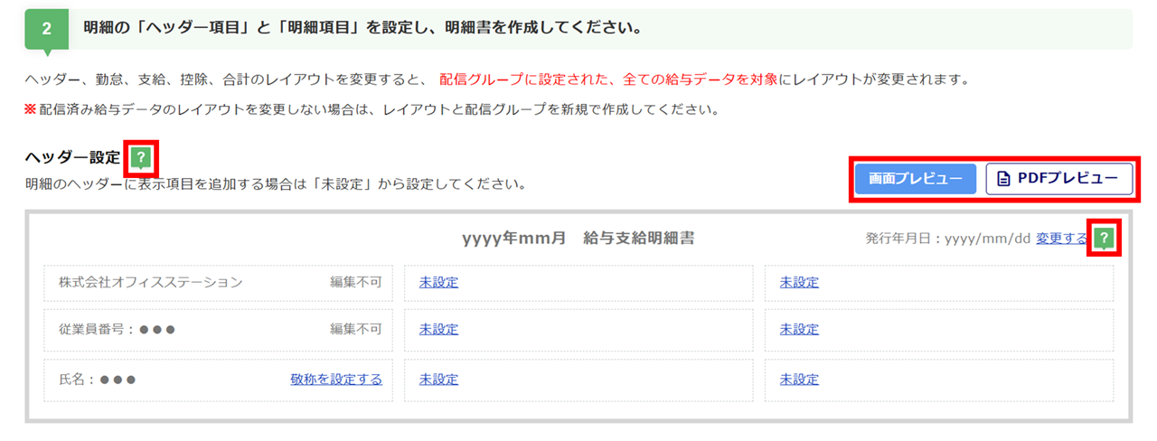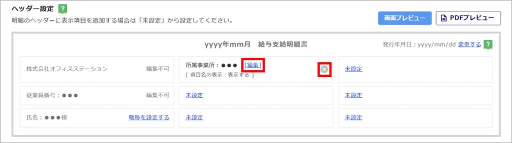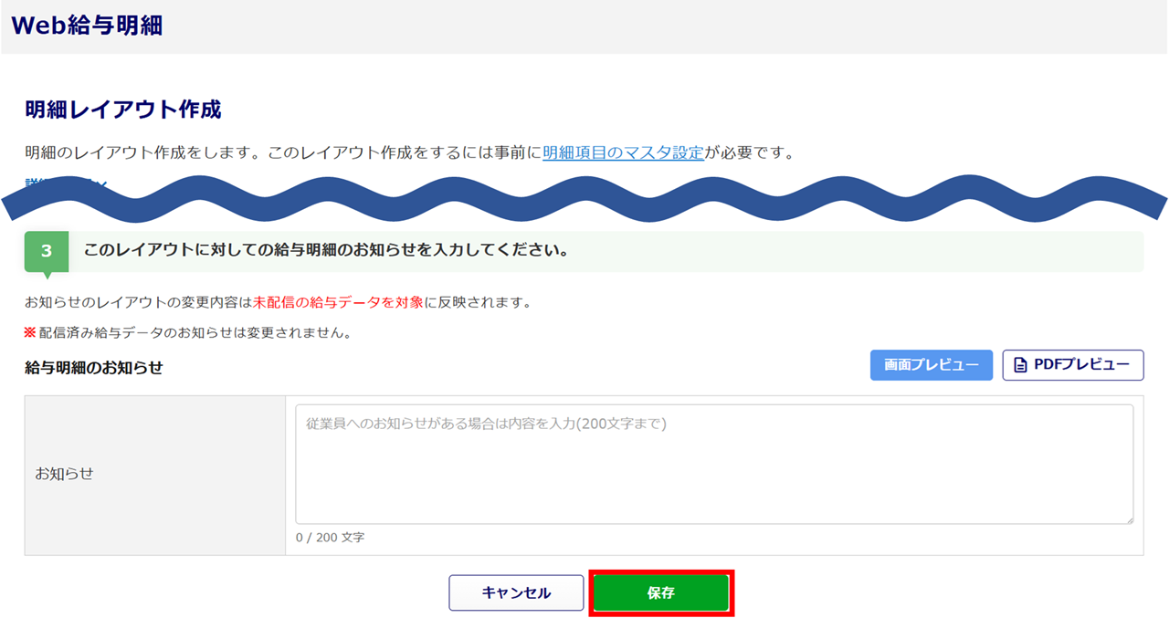設定した給与明細のお知らせの実際の表示画面およびPDF表示の確認は、[画面プレビュー][PDFプレビュー]からご確認ください。
